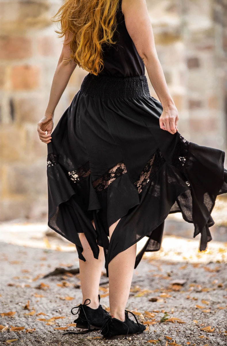 La Gonna Nera Strega/Pirata è un must-have per ogni donna che vuole aggiungere un tocco di eleganza e mistero al proprio guardaroba. Il suo design lungo e fluido crea una silhouette lusinghiera e femminile, mentre i dettagli in pizzo e le coulisse in vita aggiungono un tocco di stile.