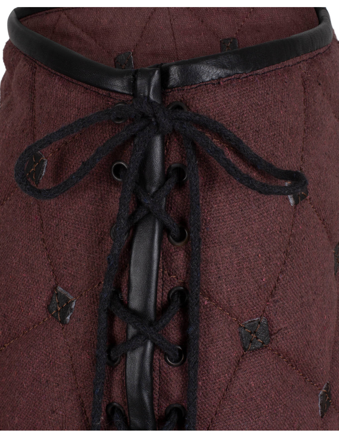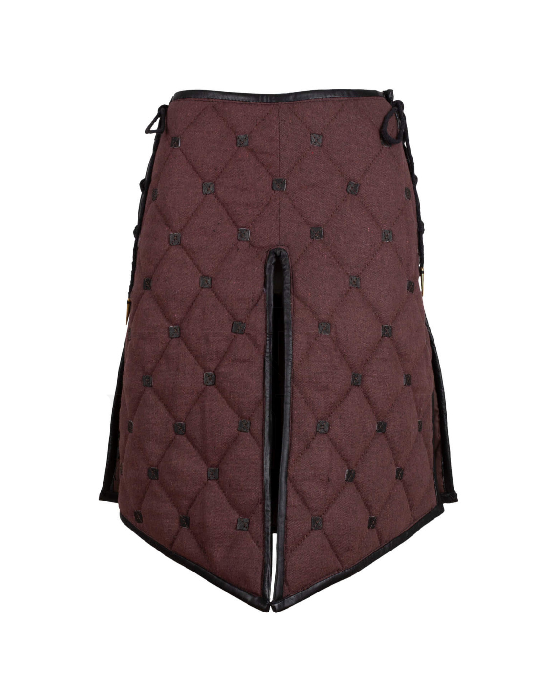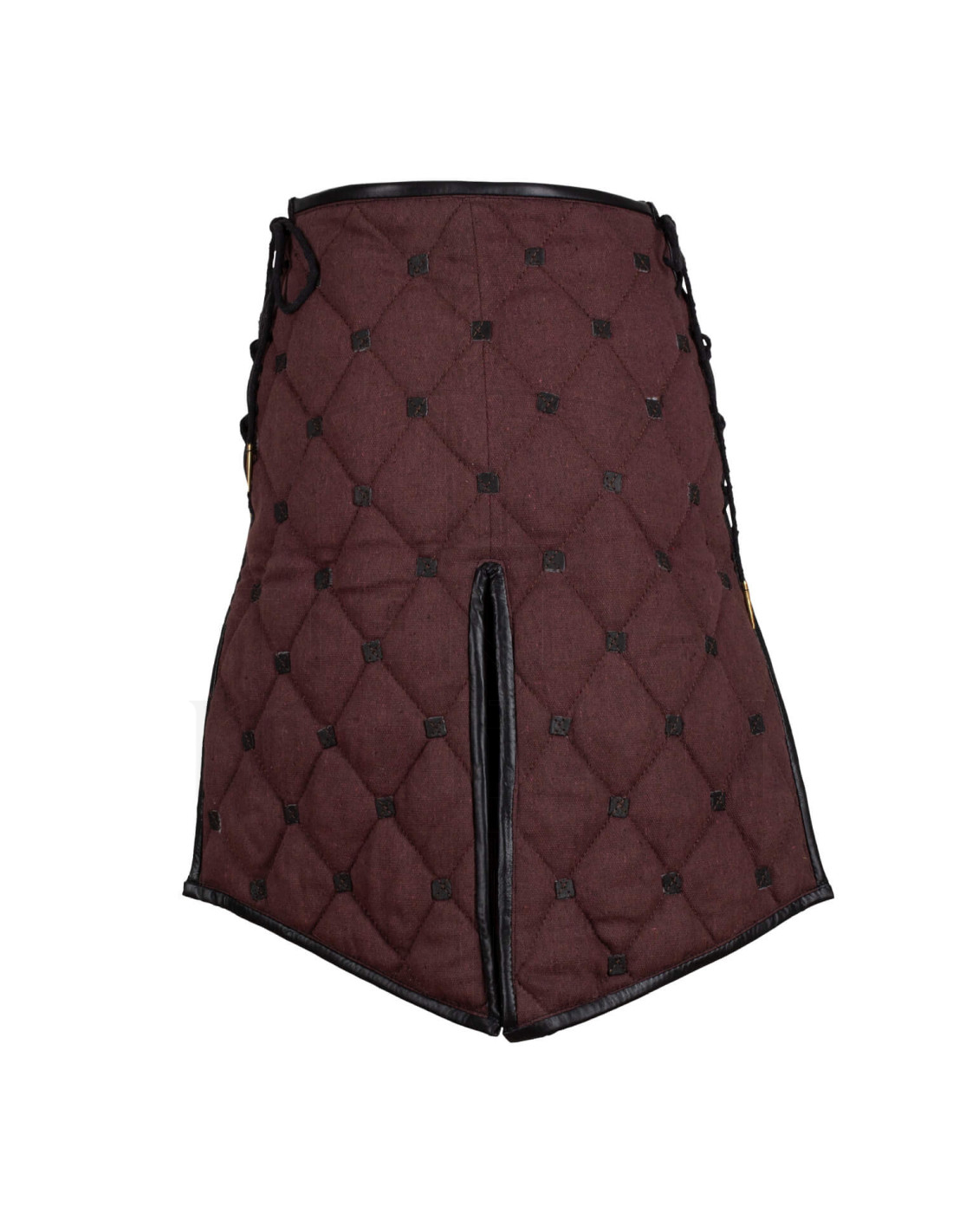 Realizzata in cotone al 100%, con un'imbottitura che offre comfort e calore in territori freddi, questa gonna si distingue per resistenza e durata. I rinforzi sui bordi e le rifiniture in nero riflettono un lavoro artigianale di alta qualità, pensato per resistere al passare del tempo e alle avventure più intense. L'apertura centrale e i lacci laterali permettono una regolazione personalizzata, garantendo libertà di movimento in ogni circostanza.