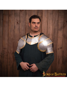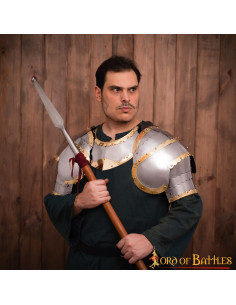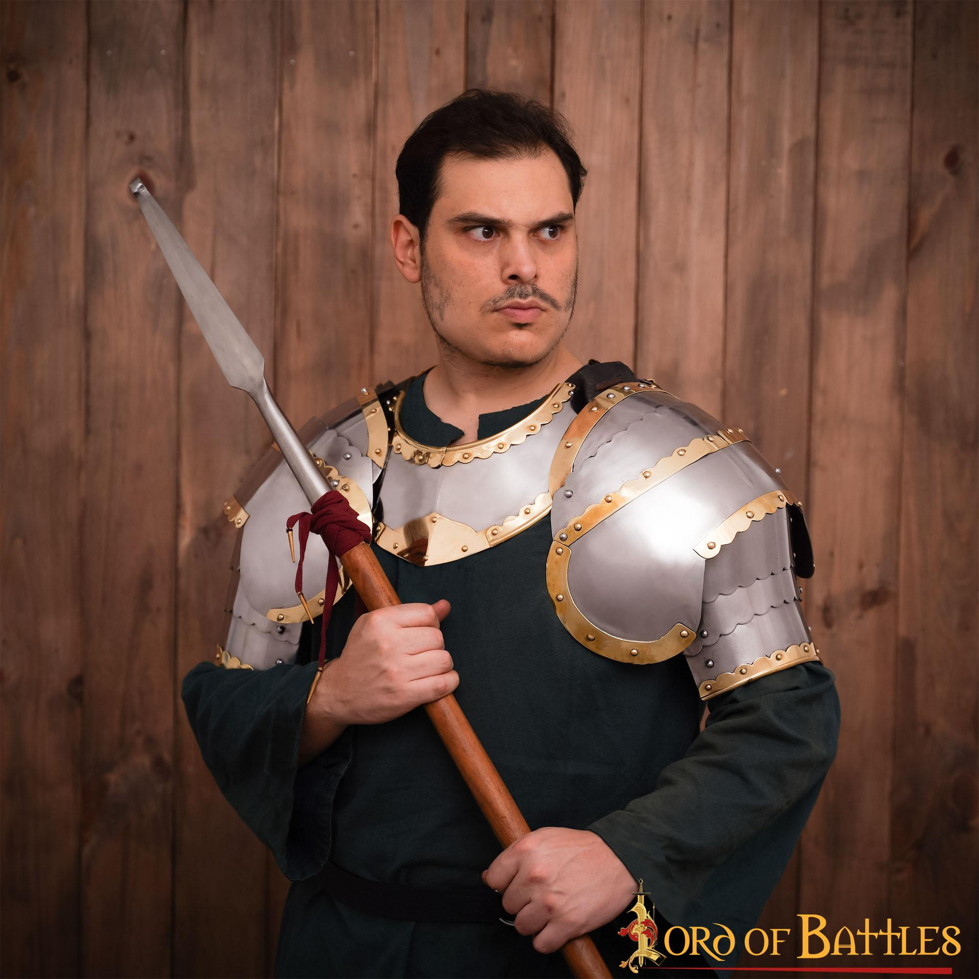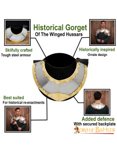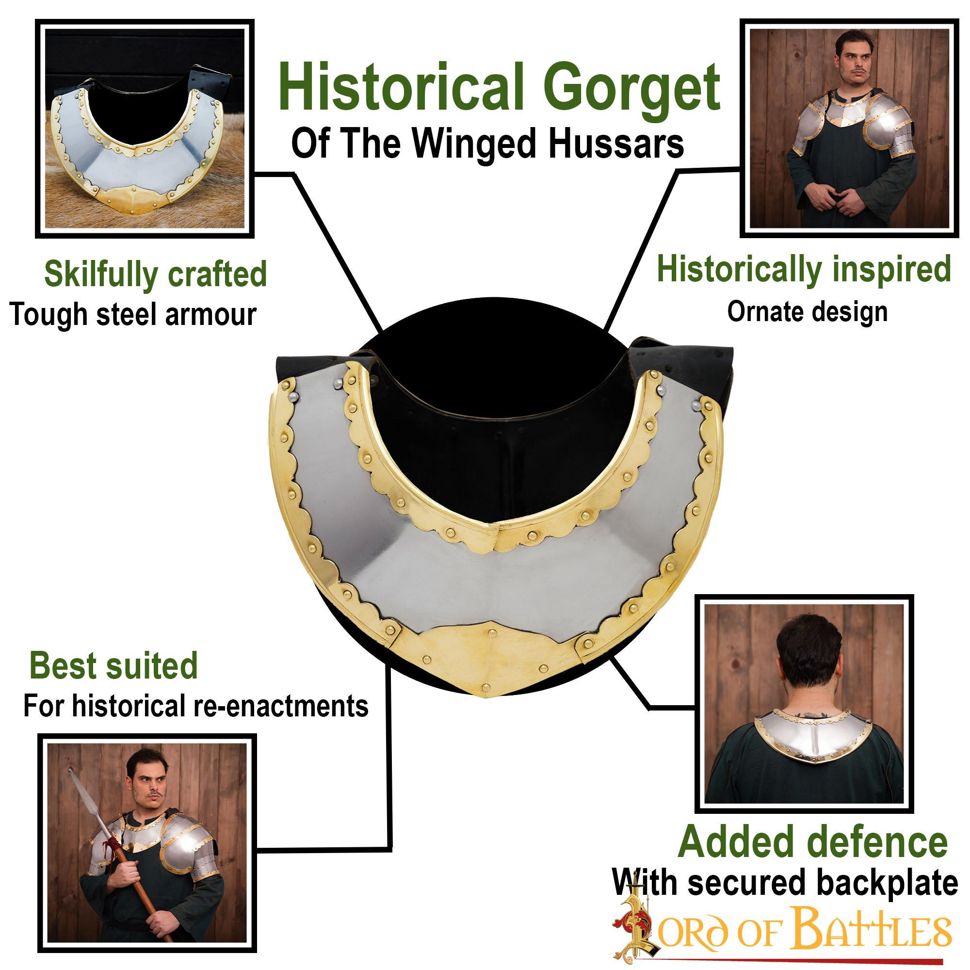 Immergiti nell'autentica esperienza medievale con la nostra gorgiera in acciaio modello ussaro con bordo in ottone! Questo accessorio sapientemente realizzato a mano è il gioiello perfetto per ogni amante dei leggendari ussari alati polacchi e della loro iconica armatura.