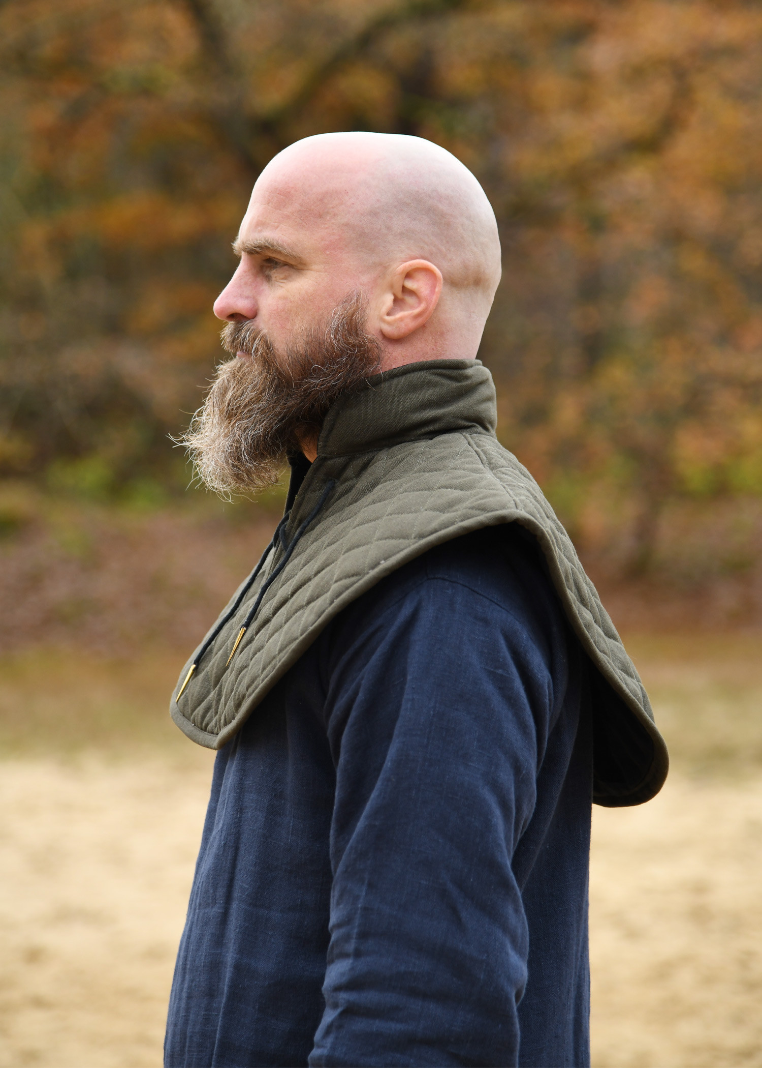 Proteggi il tuo collo con il gorjal medievale imbottito in cotone di colore verde oliva, un pezzo progettato per massimizzare il comfort e la funzionalità nei combattimenti di ricreazione storica. Ispirato ai modelli utilizzati nel medioevo, questo gorjal era indispensabile per coloro che indossavano armature a piastre o maglie, alleviando la pressione e attutendo gli impatti nell'area del collo.