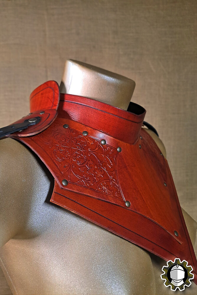 Il profondo marrone della sua finitura risalta ad ogni movimento, creando un effetto visivo che attirerà sguardi ammirati. Ogni dettaglio è stato curato meticulosamente, garantendo che questo gorjal si adatti comodamente e ti protegga, sia in un evento di ricreazione storica che in una convention di cosplay.