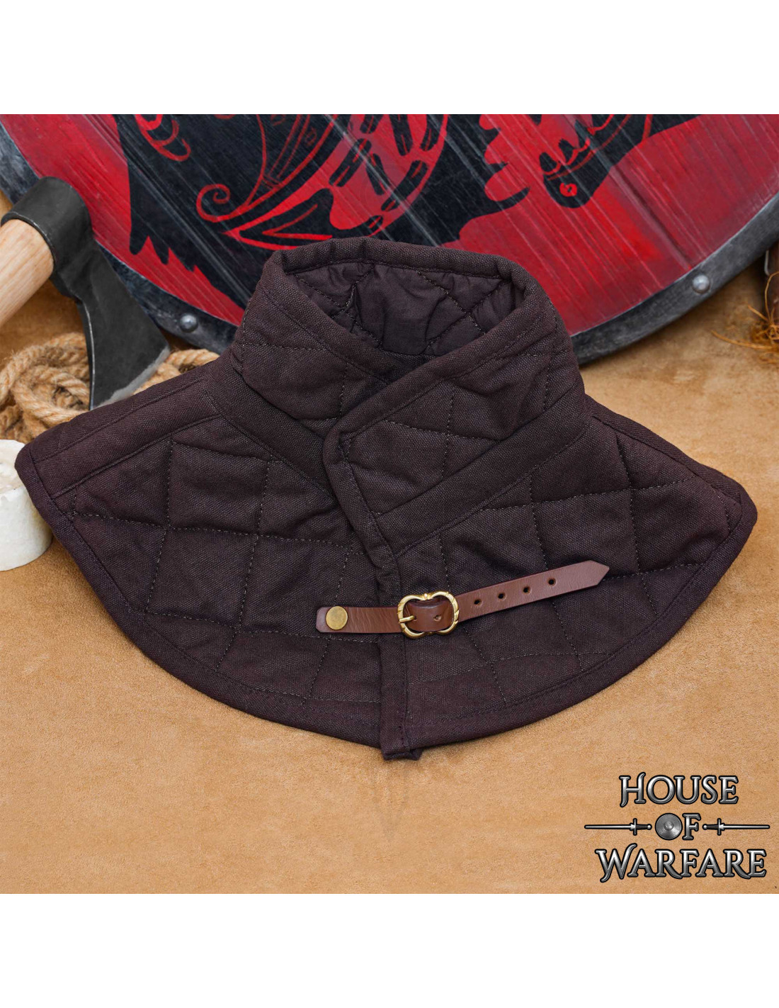 Visivamente si distingue per il suo colore marrone scuro e il suo collo alto con un ripiegamento laterale che copre e incornicia, conferendo un'aria sobria e funzionale all'insieme. Ideale per pratiche di LARP, HEMA, tornei SCA, combattimento scenico e rievocazioni, è un pezzo versatile che bilancia autenticità e rendimento.