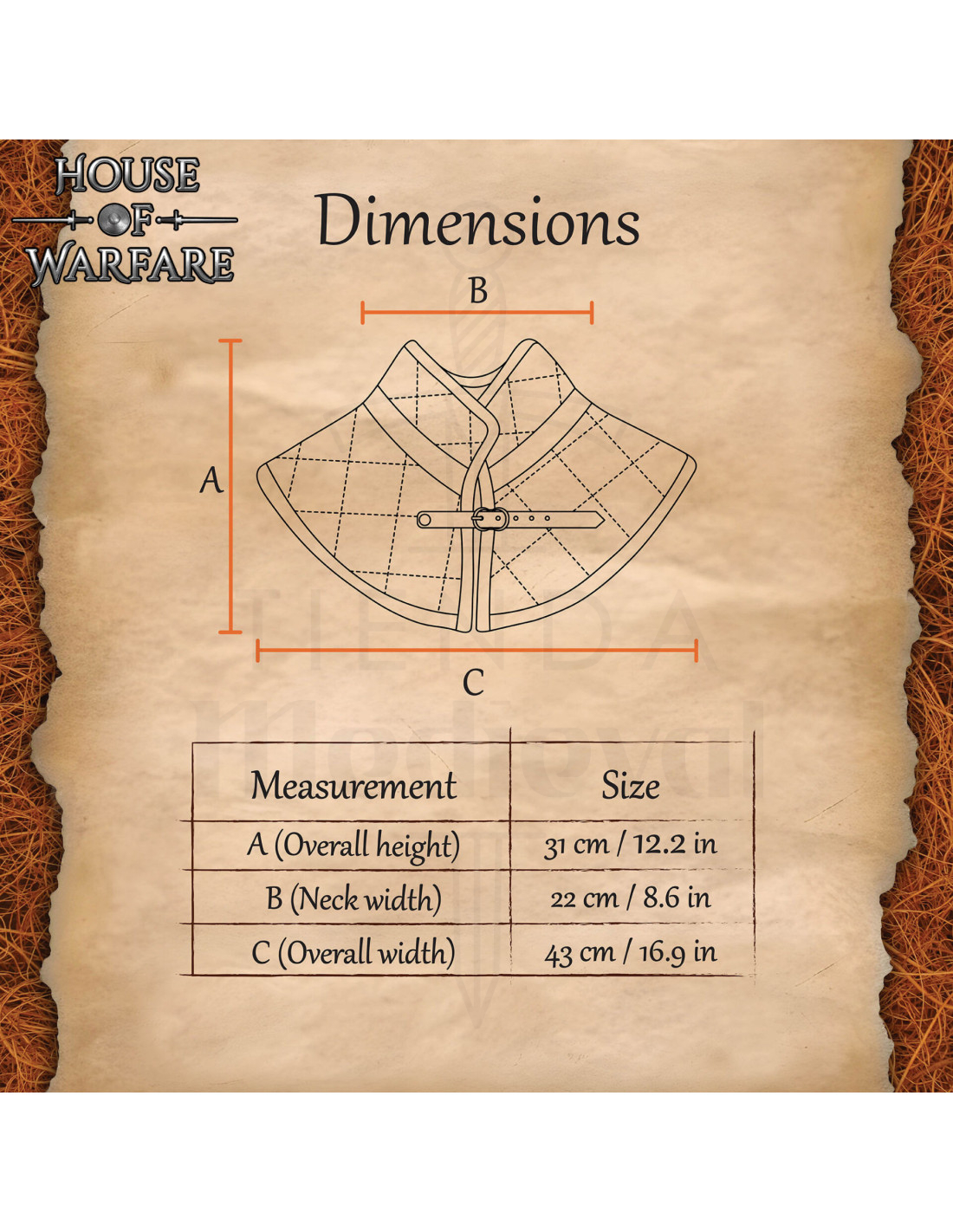 Il design a doppio strato offre una difesa aggiuntiva nelle zone che tendono a rimanere esposte quando si indossano piastre, cotta o gambeson, e allo stesso tempo mantiene leggerezza affinché i movimenti siano fluidi e agili. La cinghia in pelle chiara, con fibbia metallica dorata e una linguetta con bottone dorato, assicura una regolazione sicura e personalizzabile, offrendo una chiusura sicura e un finish visivo elegante che si adatta sia sotto l'armatura che indossato all'esterno.