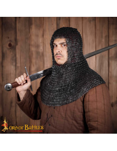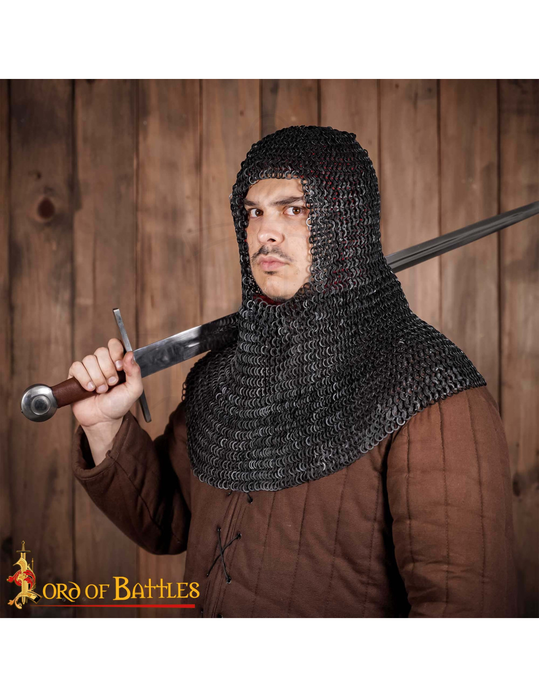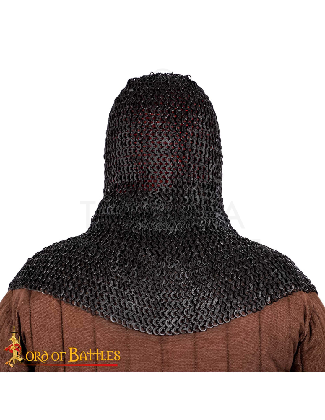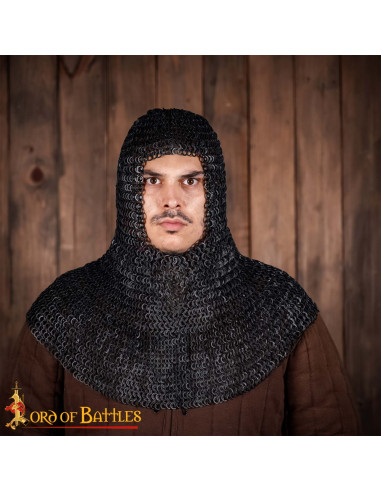 Il montaggio con anelli piatti e ribattuti offre una sensazione di robustezza che si percepisce indossandolo, garantendo sicurezza durante prove, combattimenti coreografati o lunghe giornate in ricreazioni, mantenendo allo stesso tempo la flessibilità necessaria per movimenti reali e naturali. Puoi indossarla sotto un elmo o combinata con imbottiture per maggiore comfort, facilitando la sua integrazione con il resto dell'equipaggiamento senza complicazioni.