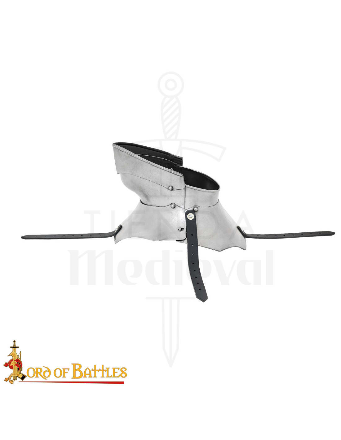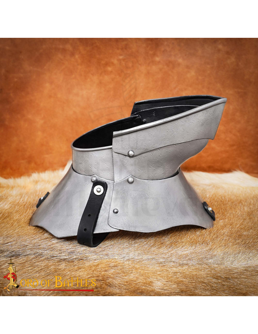 Questo gorjal fatto a mano combina protezione e libertà, grazie al suo bevor mobile che consente di sollevare facilmente la piastra frontale, lasciando che la mobilità parli quando più ne hai bisogno. Il design copre il collo e la parte superiore del petto, offrendo una sensazione di sicurezza che non appesantisce durante lunghe giornate in eventi o prove.