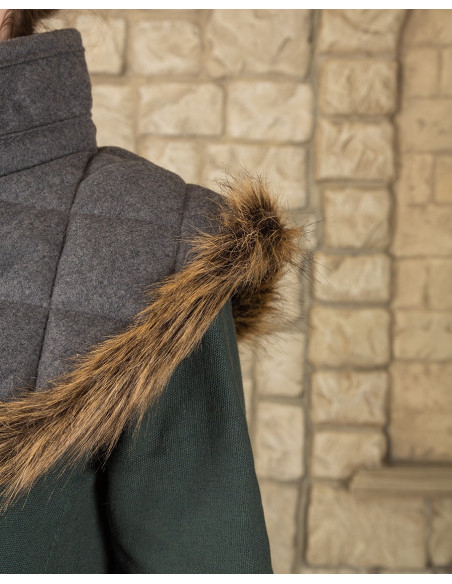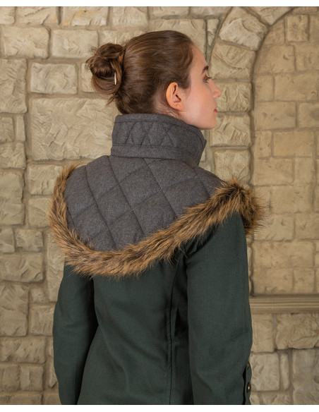 La sua cucitura a griglia e linee diagonali non solo è estetica, ma struttura anche l'imbottitura per mantenere il calore distribuito in modo uniforme, evitando zone fredde. Il colore grigio scuro si abbina a strati, cappotti e costumi d'epoca, aggiungendo carattere a qualsiasi outfit senza appesantirlo.