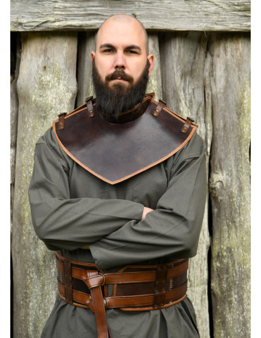 Con una lunghezza di 48 cm e un peso di 672 grammi, questa gorgiera è abbastanza leggera da non essere un peso sul campo di battaglia, ma abbastanza forte da proteggerti da qualsiasi attacco. Il suo materiale in pelle di alta qualità ne garantisce la durata e la resistenza nel tempo.