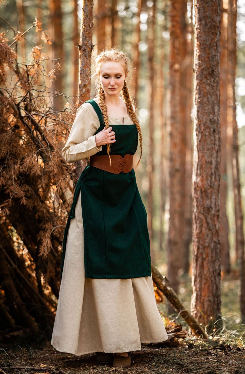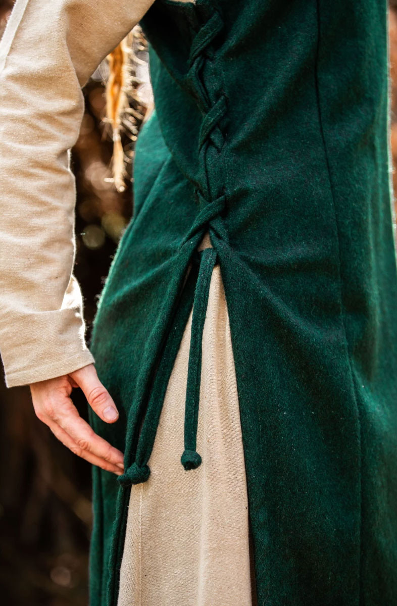 Scopri il grembiule medievale vichingo Aila in lana, verde! Questo fantastico grembiule ti riporterà all'era vichinga con il suo design autentico e dettagli unici.