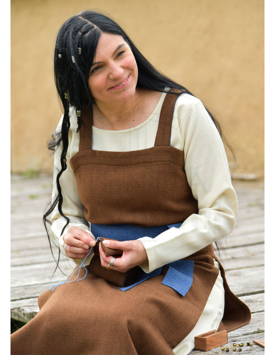 La costruzione pensata per essere indossata con facilità è perfetta per chi combina indumenti interni storici. Le aperture laterali permettono di indossare il vestito su altri strati senza sforzo, facilitando i cambi e mantenendo la silhouette tradizionale. Completandolo con fibbie ovali, una cintura e accessori coordinati, ottieni un insieme coerente e visivamente convincente, fedele ai reperti storici che hanno ispirato la sua creazione.