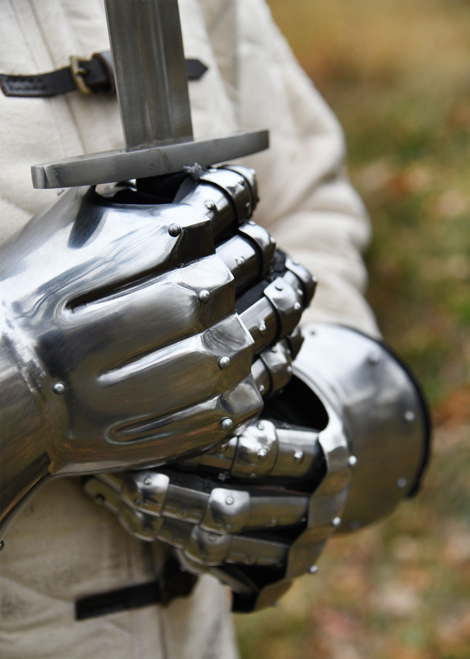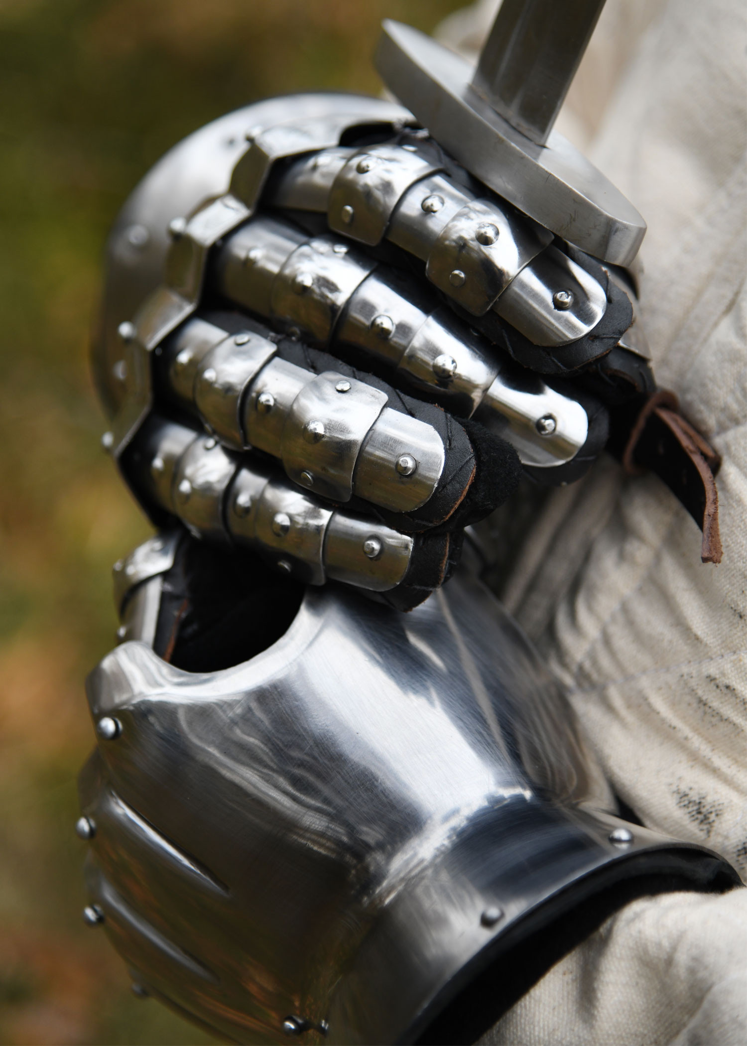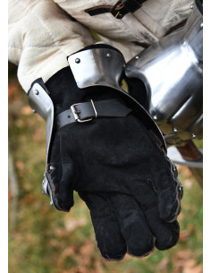 Realizzati a mano in acciaio da 1,6 mm (16 ga), questi guanti sono robusti ma leggeri, garantendo comfort e agilità nel combattimento. L'interno è foderato con morbidi guanti in camoscio nero, mentre i rinforzi in pelle spessa sulle dita e le cinghie in pelle assicurano una vestibilità salda e sicura. Le borchie decorative non solo conferiscono uno stile medievale autentico, ma rinforzano anche la struttura dei guanti.