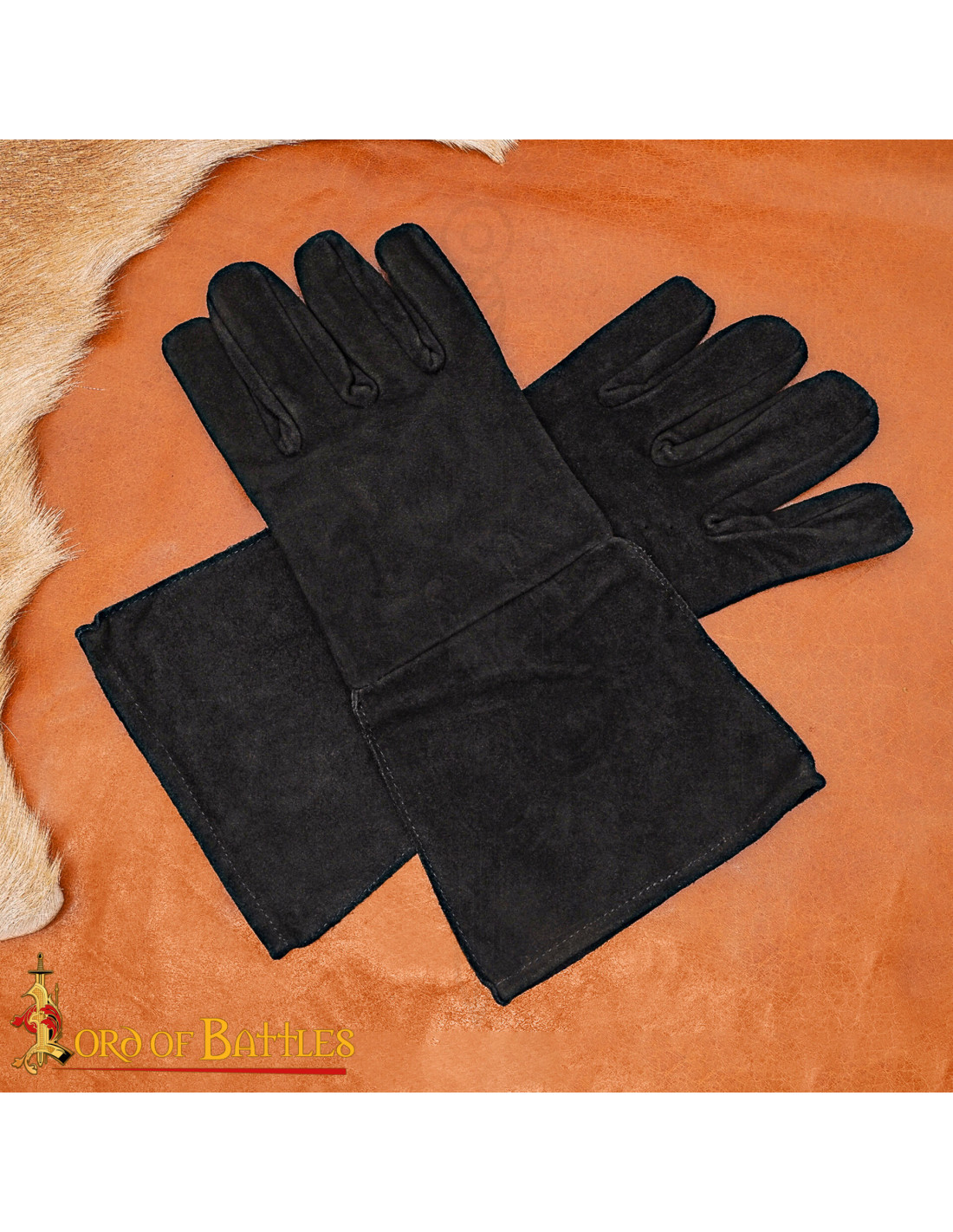 Cerchi protezione con stile e autenticità? Questi guanti medievali in pelle scamosciata nera ti permettono di rivivere epoche passate con un tocco di eleganza e funzionalità. Con il loro design classico, coprono anche i polsi e parte degli avambracci grazie ai lunghi polsini, offrendo una difesa aggiuntiva durante la manipolazione di armi, armature o in ricostruzioni storiche.