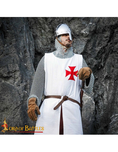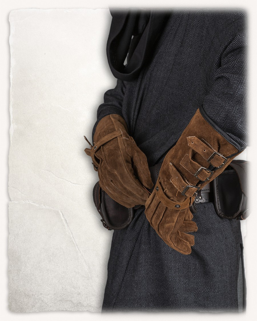 Realizzati in pelle scamosciata di alta qualità, questi guanti offrono una sensazione morbida sulla pelle, mantenendo al contempo la fermezza necessaria per resistere a un uso intensivo. La lunghezza ampliata copre parte dell'avambraccio, proteggendo e stilizzando allo stesso tempo, perfetto se cerchi un pezzo che combini estetica e utilità in ricreazioni storiche, eventi o attività di combattimento leggero.