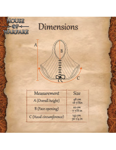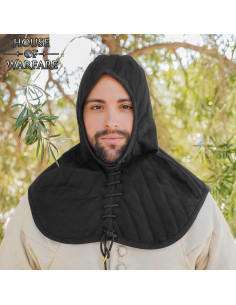 Il contorno arrotondato si estende sulle spalle e sulla parte superiore del petto, offrendo una copertura che funge da strato protettivo sotto elmetti, gambeson o maglie, ma anche come pezzo indipendente per un allenamento leggero o per completare un costume storico con stile.
