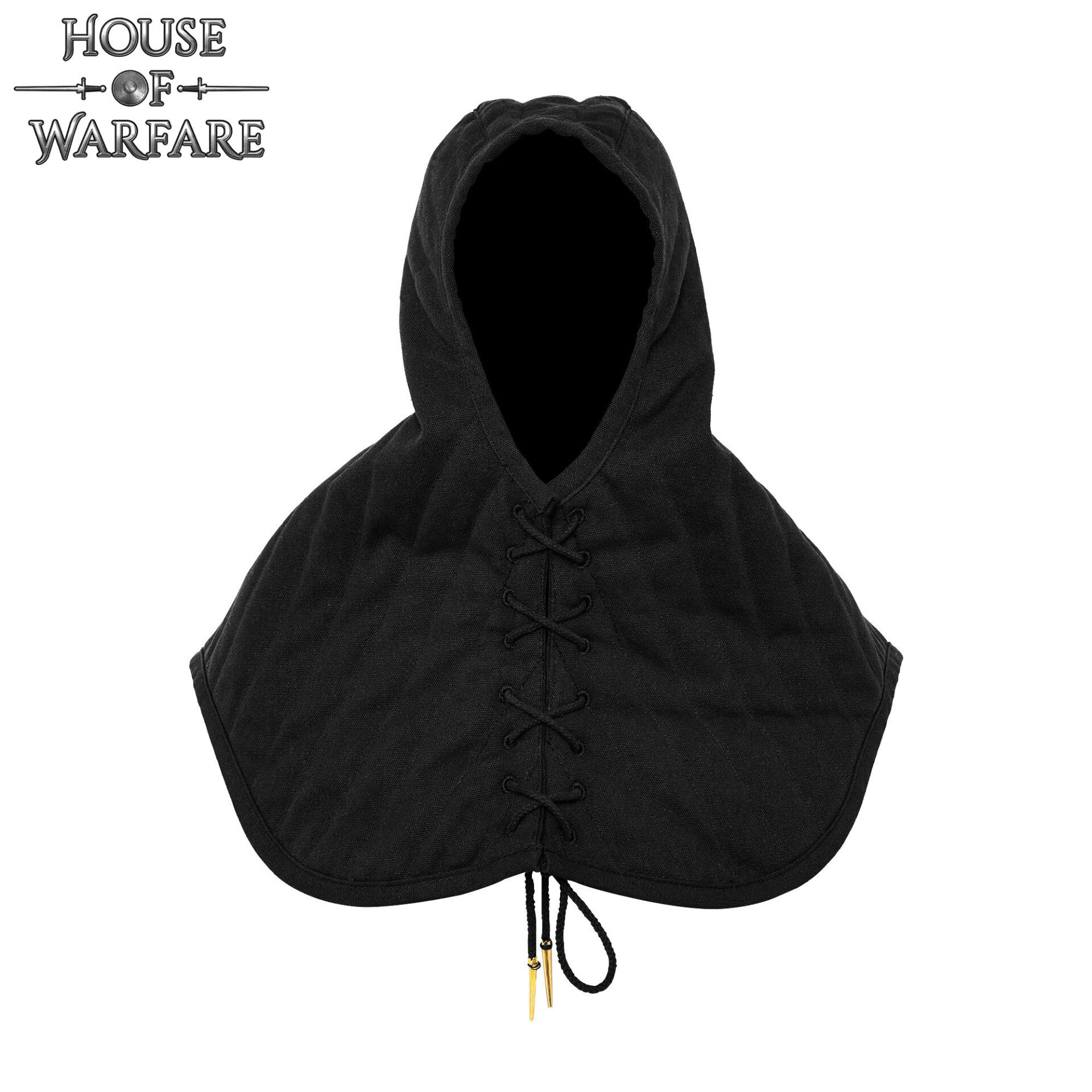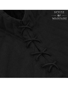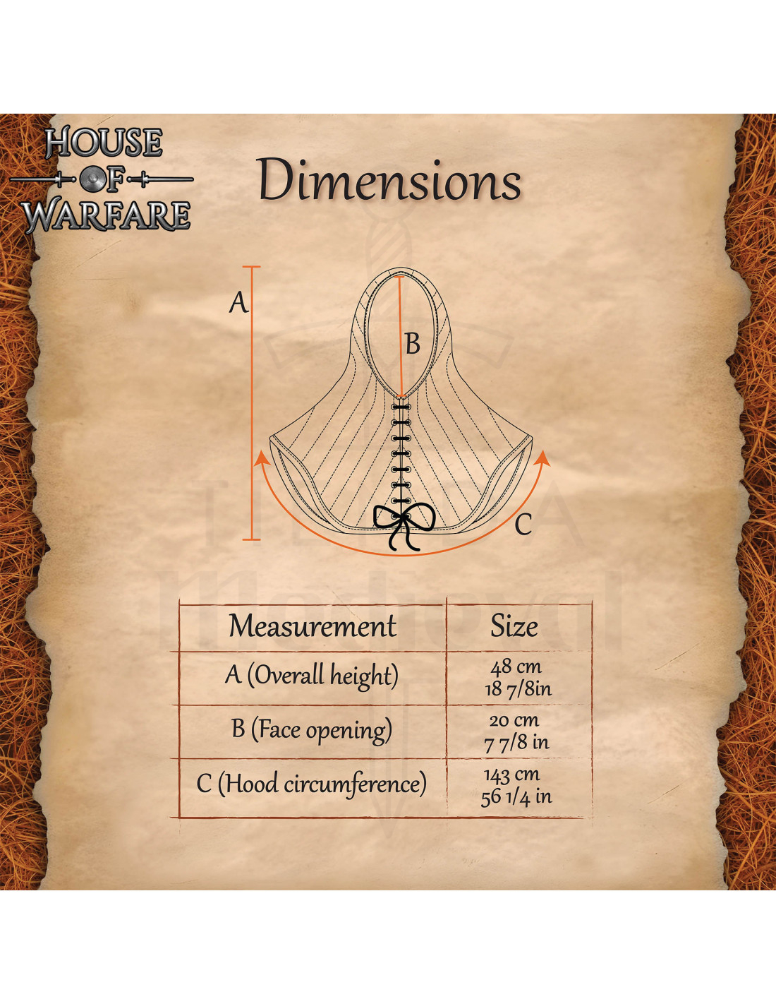 La chiusura frontale con lacci intrecciati consente di regolare il gugel al volume necessario, ottenendo una calzata sicura e facile da regolare in combattimento o tra le scene. Le rifiniture metalliche alle estremità facilitano la presa e impediscono che i lacci si sfilaccino, per un uso continuato senza preoccupazioni.