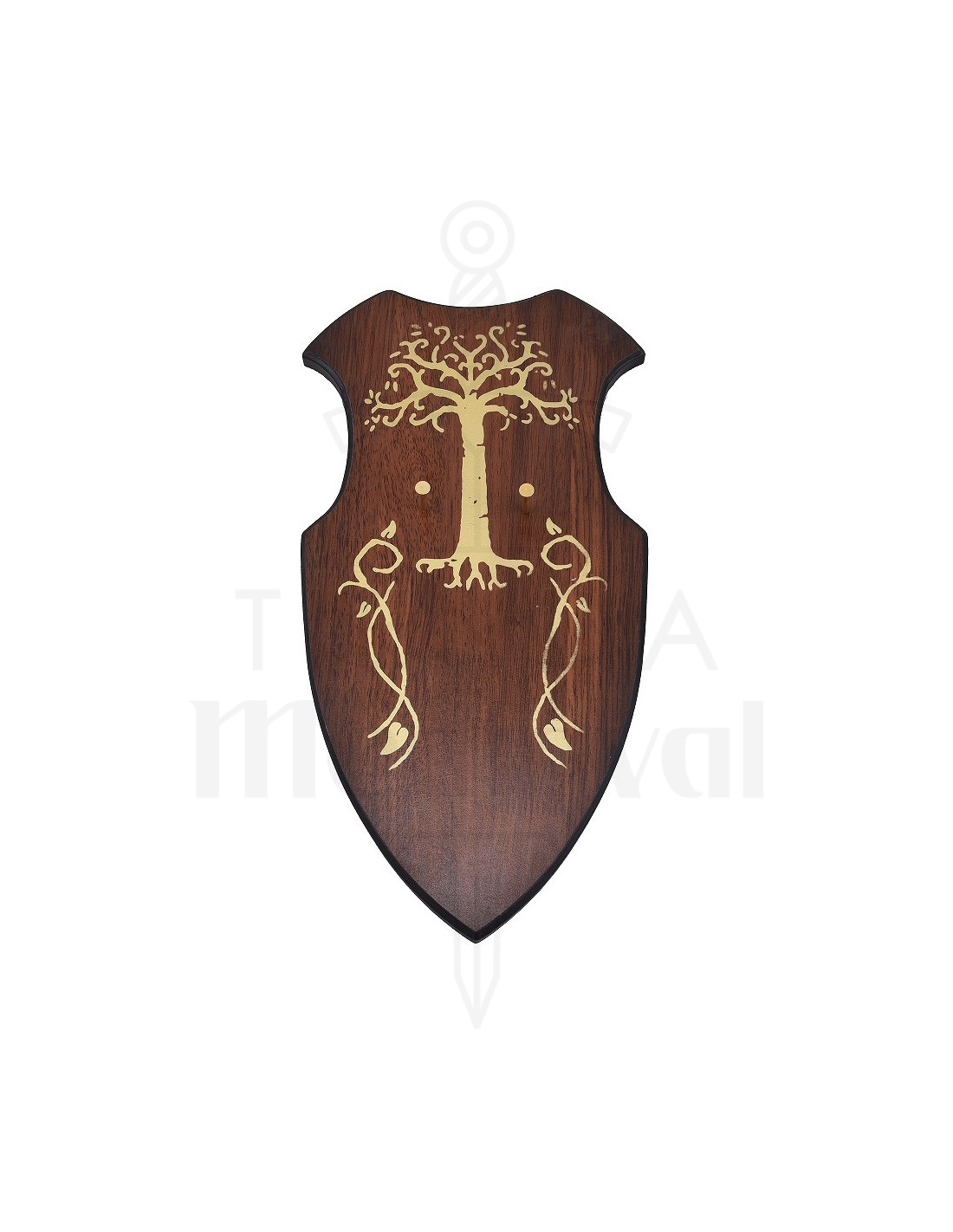 Questo pezzo combina il calore del legno con una finitura scura e lucida che valorizza qualsiasi ambiente, mentre la sua silhouette allungata e i bordi curvi aggiungono presenza senza occupare troppo spazio. Il pannello decorativo, con un design dorato che mostra un albero con radici visibili e rampicanti laterali, fornisce un punto focale elegante, pensato per completare la guardia della tua spada e aggiungere profondità visiva all'esposizione.