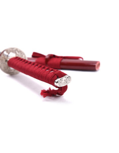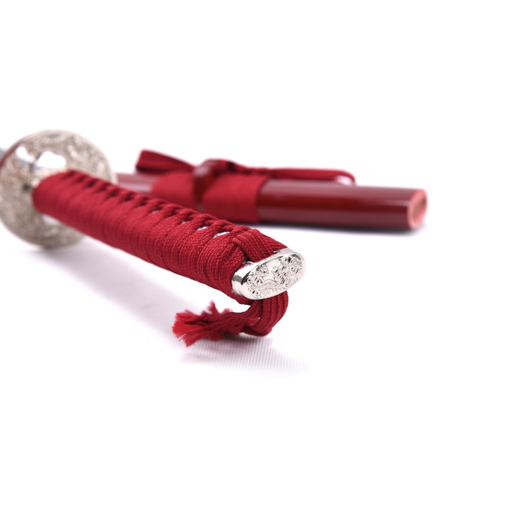 Ma ciò che rende davvero speciale questa katana è il suo incredibile design. Il fodero in legno è splendidamente dettagliato e laccato in una tonalità rosso vino rosso per un look lussuoso e accattivante. E come tocco finale, il drago in rilievo sulla lama le conferisce un tocco esotico e misterioso.