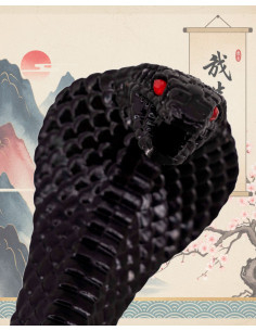 L'impugnatura, rivestita in ecopelle che imita la pelle di serpente e rifinita con un pomo a forma di cobra con occhi rossi, offre una presa comoda e sicura, oltre a un dettaglio scenico che cattura gli sguardi. La griglia e la sezione con texture che riproduce le squame aggiungono contrasto e tatto, rendendo l'atto di sostenerla o posizionarla sul supporto un'esperienza elegante e affidabile.