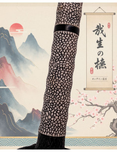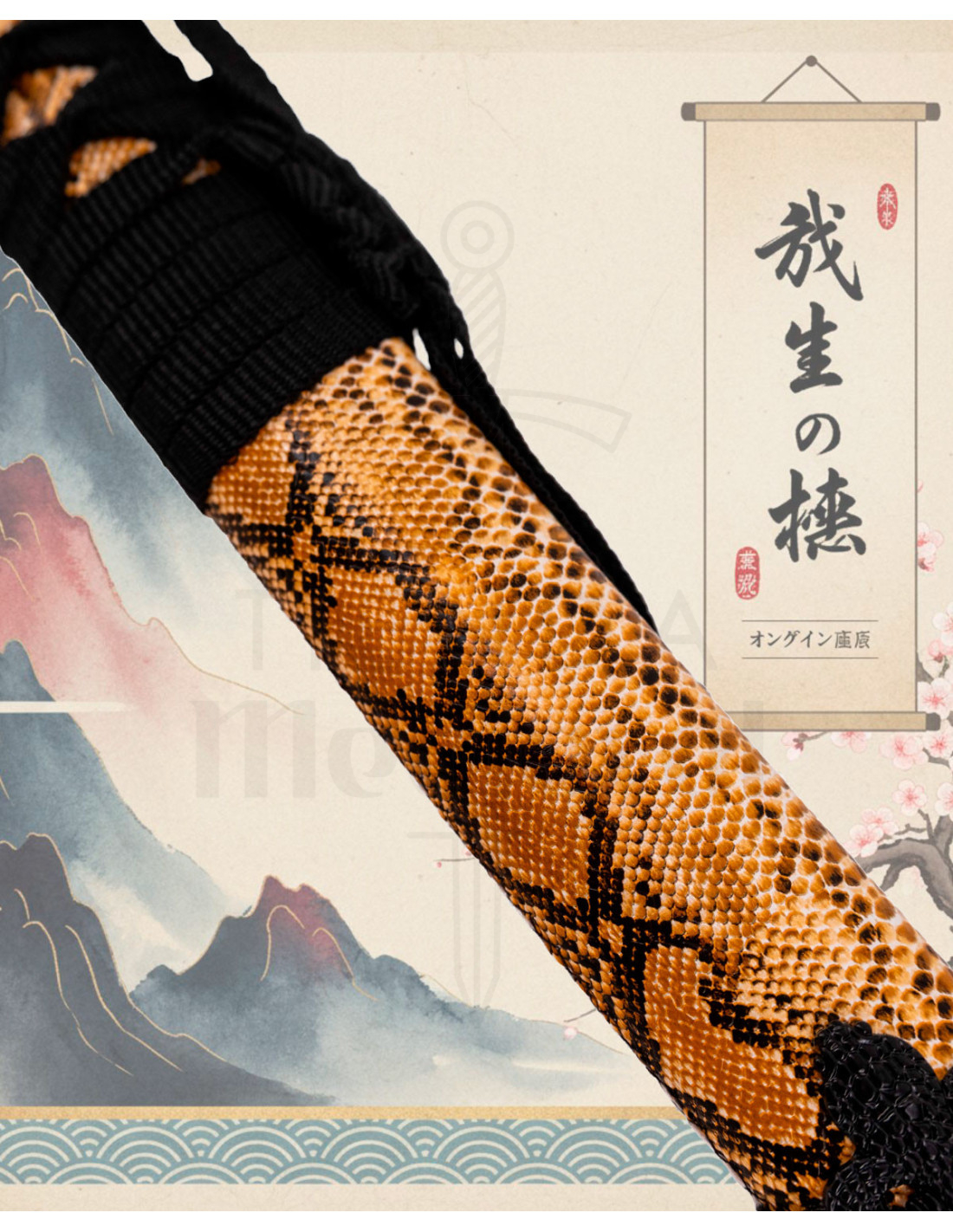 La custodia combina cordura nera resistente con una guaina in similpelle di serpente in tonalità marrone chiaro, decorata con disegni scuri che riproducono squame naturali, e ancoraggi metallici neri che assicurano una presa stabile. Questa combinazione facilita il trasporto e mantiene il pezzo protetto, rafforzando al contempo la sua estetica distintiva.