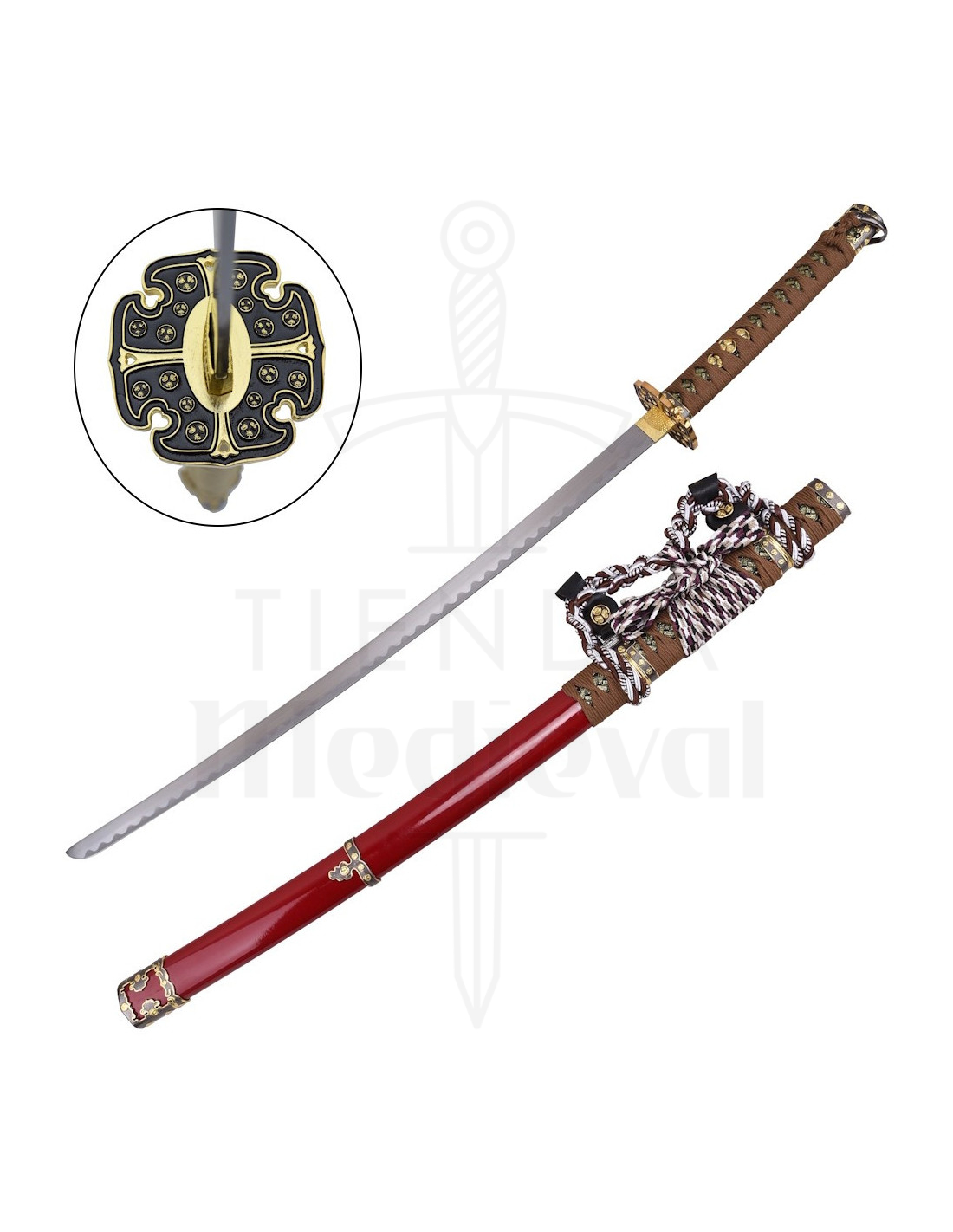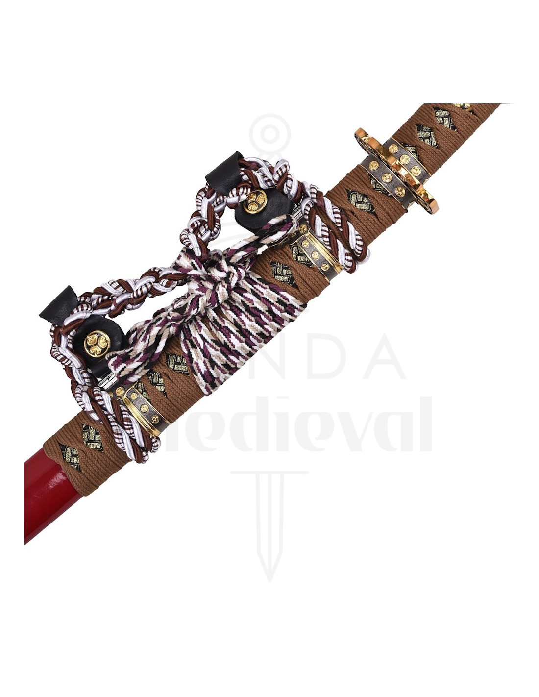 Il guardamano piccolo con decorazione dorata e nera funge da dettaglio focale, apportando eleganza e continuità con le rifiniture metalliche della guaina. La guaina in rosso brillante, rifinita con pezzi dorati e decorata con un nastro intrecciato in bianco, nero e marrone, aggiunge contrasto e dinamicità, trasformando la katana in un oggetto ornamentale che armonizza con stili classici e moderni.