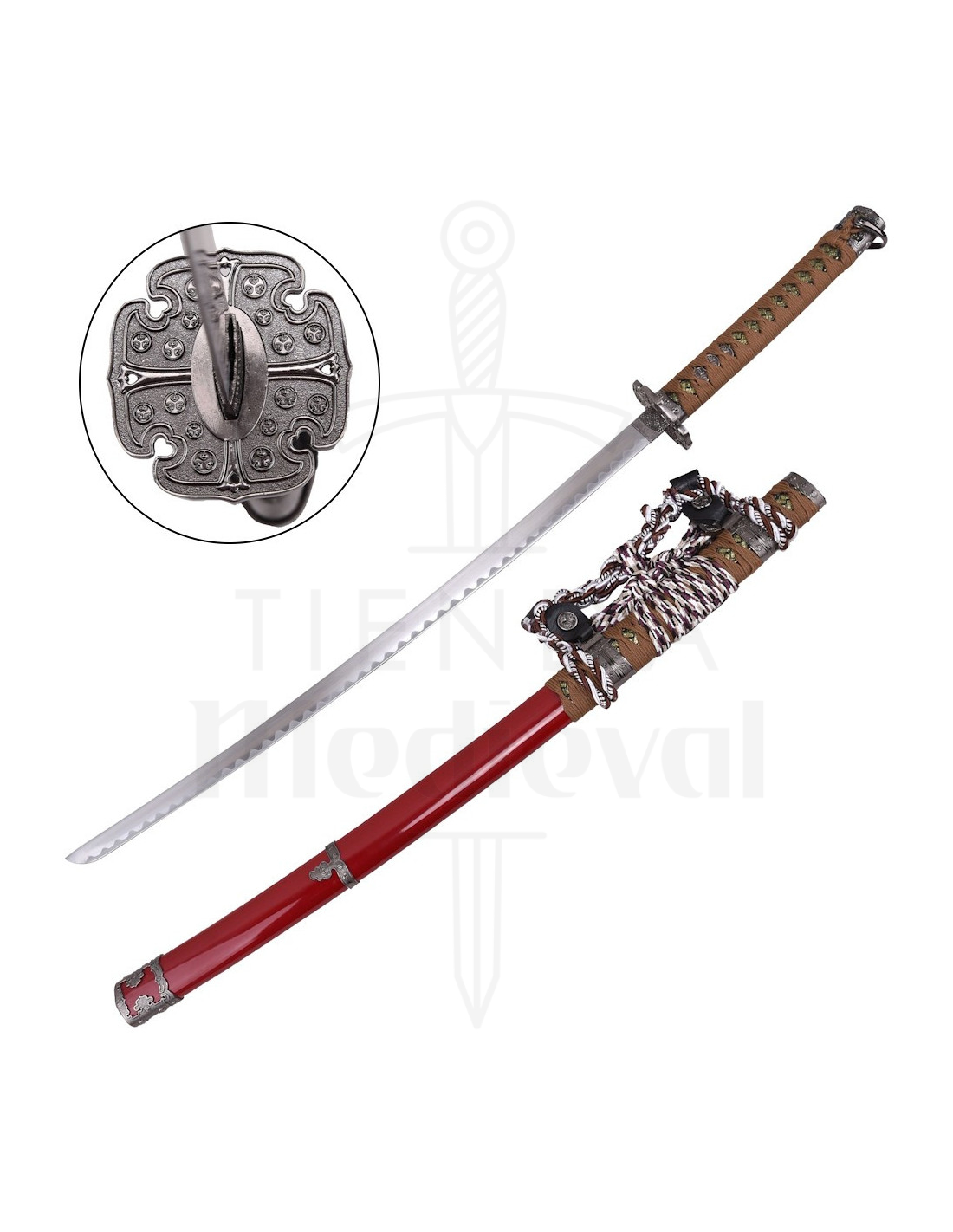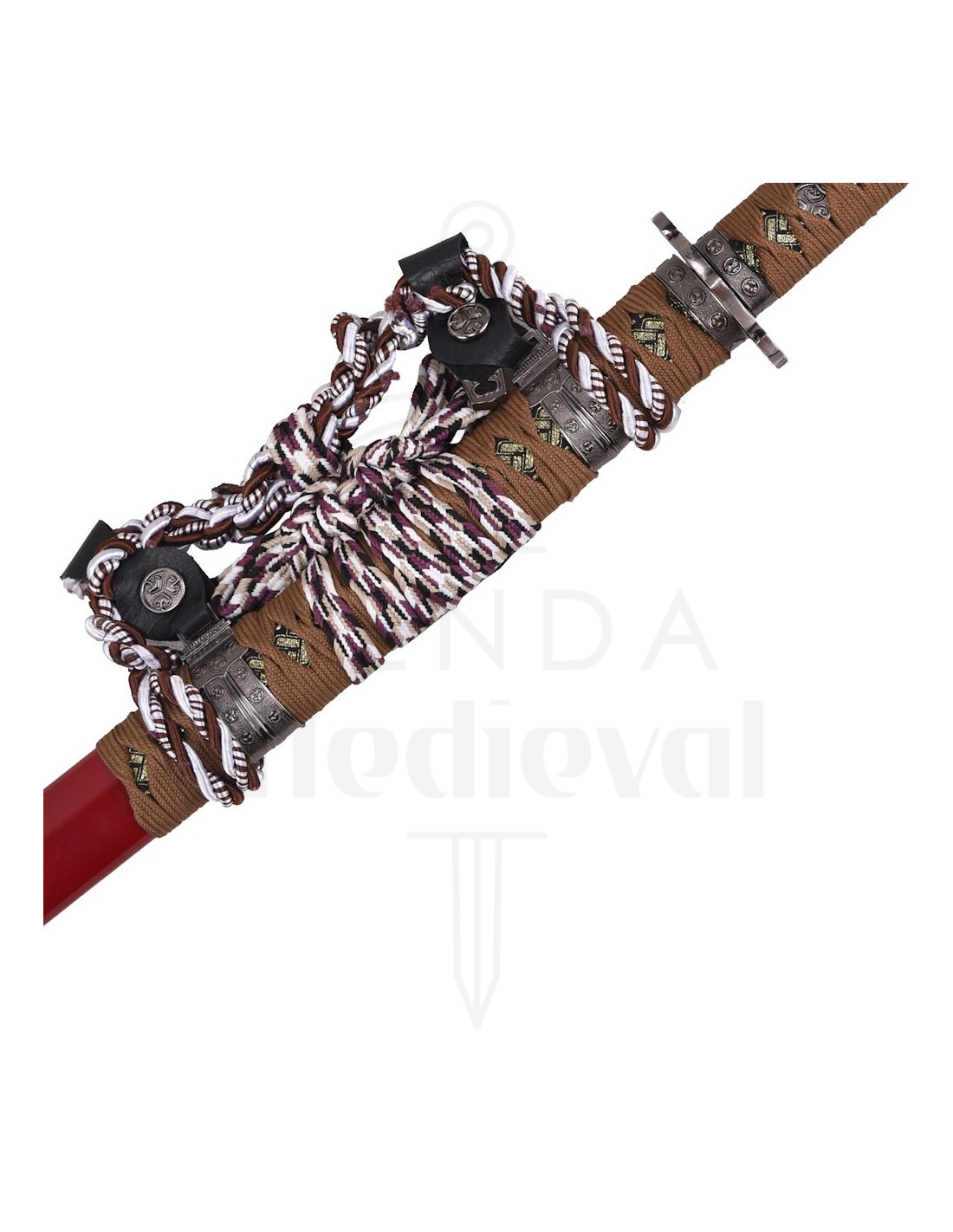 Il fodero rosso brillante, decorato con ferri e corde bianche, marroni e nere, trasforma l'elemento in un pezzo decorativo pronto per essere esibito; i cordini annodati non solo abbelliscono, ma permettono di appenderlo o fissarlo con stile. Se desideri acquistare la Katana decorativa tradizionale giapponese con cordino marrone-bianco e argento, stai scegliendo un'opera che bilancia estetica e funzionalità per esporre o regalare.