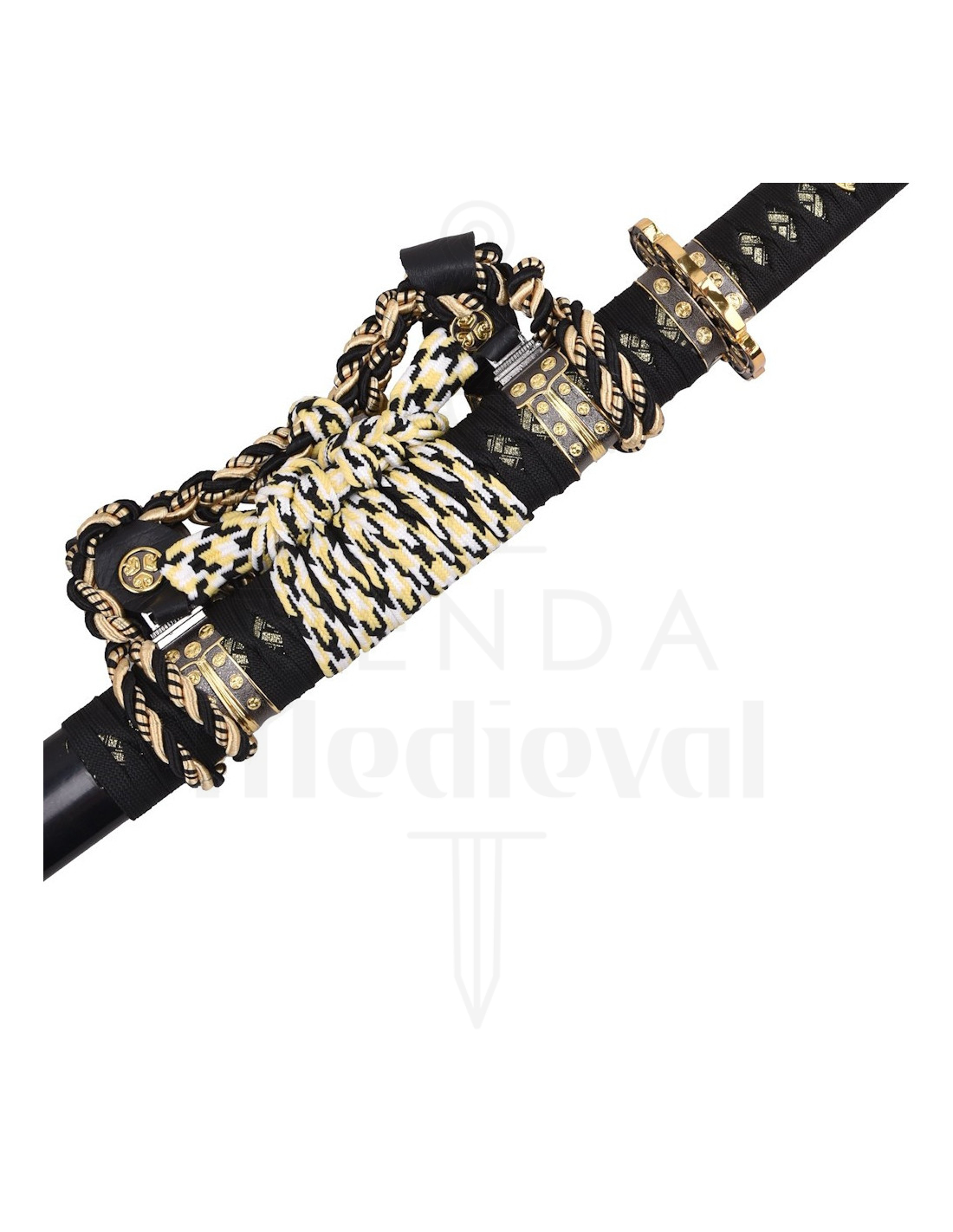 Il manico avvolto in corda scura con dettagli dorati offre un aspetto raffinato e una texture che invita a toccarla, perfetto per esposizioni o sessioni fotografiche. La guardia quadrata in metallo, con bordi dorati e neri, agisce come un punto focale ornamentale, apportando equilibrio visivo e un'aria signorile che eleva qualsiasi collezione.