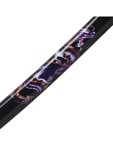 La saya, in legno laccato nero lucido, mostra un drago grafico su uno dei suoi lati e un cordino nero legato nella parte superiore, dettagli che rendono il tutto un elemento perfetto per essere appeso, esposto o regalato. La lucentezza della lacca e il motivo del drago generano un equilibrio tra sobrietà e drammaticità, ideale per coloro che cercano un pezzo con carattere.