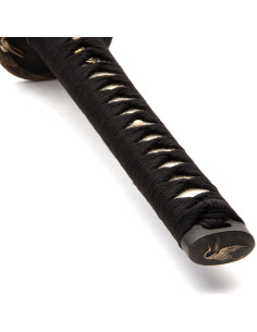 La Shogun Tsuru Katana si distingue per i dettagli ornamentali: la tsuba, il collare e il pomo raffigurano la gru, simbolo giapponese di buona fortuna, longevità e pace. Questi elementi, realizzati in ottone con finitura invecchiata, aggiungono un tocco di eleganza e significato alla katana. Il manico, realizzato in vera pelle di razza e avvolto in corda, offre una presa salda e confortevole.