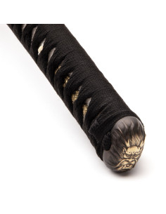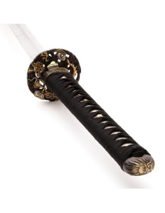 La tsuba, o guardia, è decorata con un drago, figura chiave della mitologia giapponese che simboleggia il potere, la protezione e il controllo sugli elementi, come la pioggia e i fiumi. I dettagli sulla tsuba non solo evocano queste potenti immagini, ma contribuiscono anche all'equilibrio e alla funzionalità della katana. I componenti metallici, come la manopola, sono realizzati in ottone con finitura invecchiata che ne esalta l'aspetto classico e robusto.