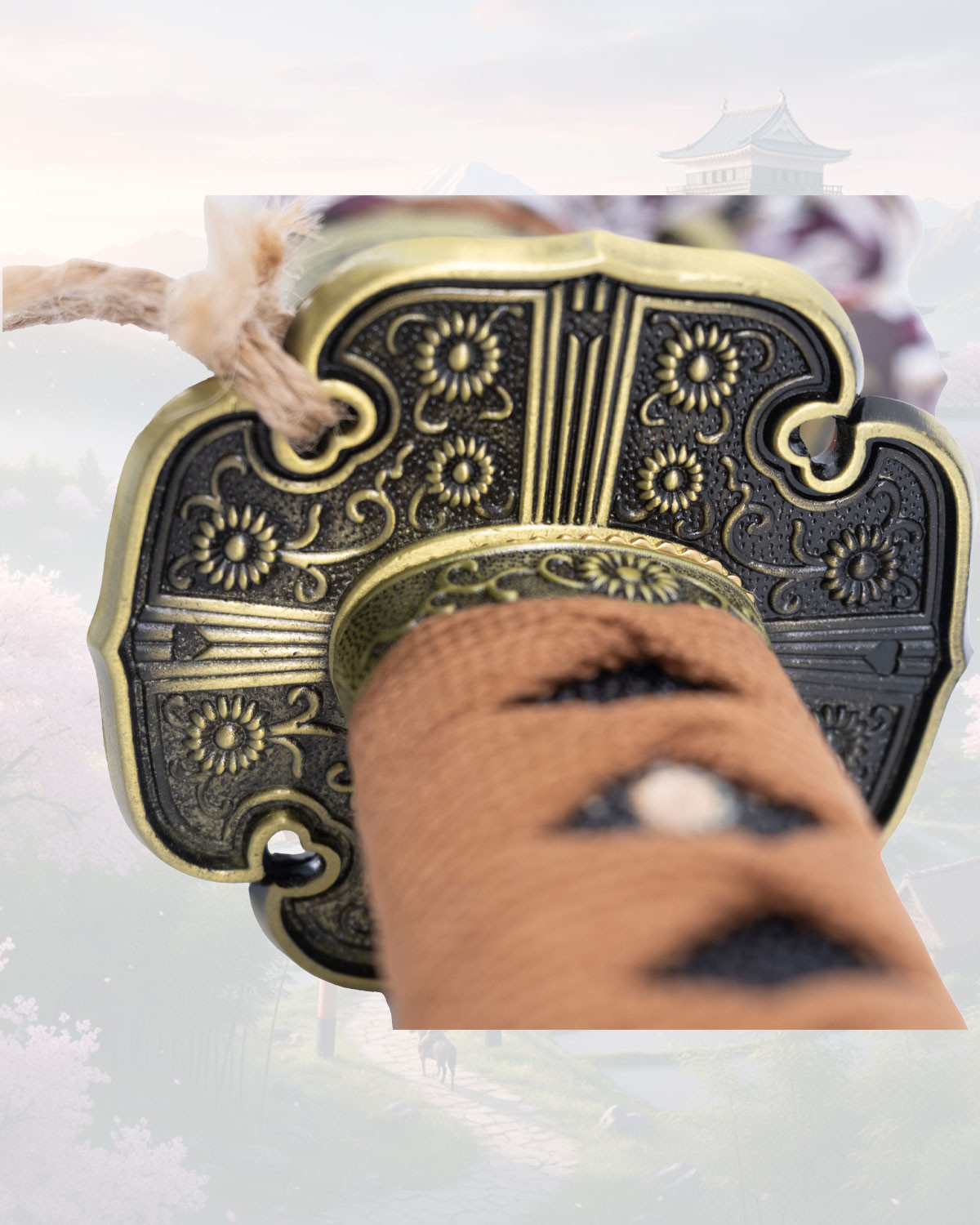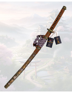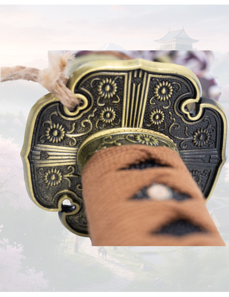 Il tsuka avvolto in una treccia marrone, rifinito con pelle di serpente autentica, conferisce all'insieme una presa autentica e tattile, ideale per coloro che apprezzano la sensazione di tradizione alla mano. La tsuba e le finiture metalliche in tonalità ottone anticato conferiscono un'aria classica, che si armonizza con la saya incisa in tonalità marroni e beige, decorata con motivi floreali e figure di guerrieri ancestrali, perfetta per raccontare una storia ogni volta che la guardi.