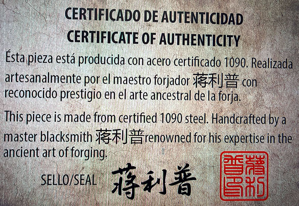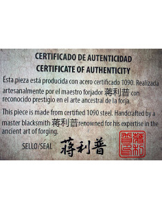 Ogni Katana Kuro Kami Hachiman Lo Spirito Protettore Eterno nasce da un processo artigianale ereditato, supervisionato dal maestro Jiag Li Pu, il che garantisce una finitura meticolosa e una personalità unica in ogni pezzo. Questa dedizione si nota nei piccoli dettagli: i rinforzi metallici, il cordino intrecciato in bianco, marrone e nero e le etichette appese che accentuano il suo carattere autentico.