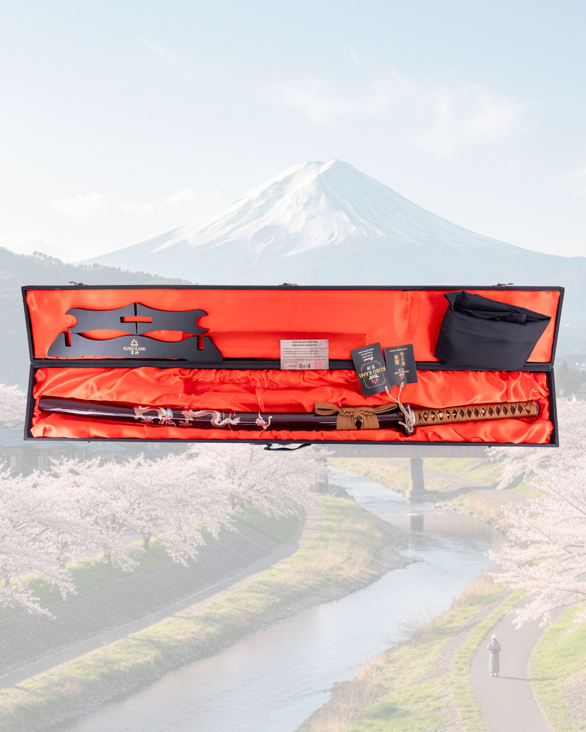 Forgiata da mani che hanno ereditato un mestiere millenario, questa spada incarna pazienza e carattere, ogni minuto di lavoro imprimendo una presenza che si percepisce al tatto e alla vista. L'acciaio damascato, con il suo motivo vivo e certificato, offre una sensazione di solidità ed eleganza, mentre il hamon inciso rivela il Monte Fuji al centro della lama, un dettaglio che trasforma la spada in un racconto visivo.