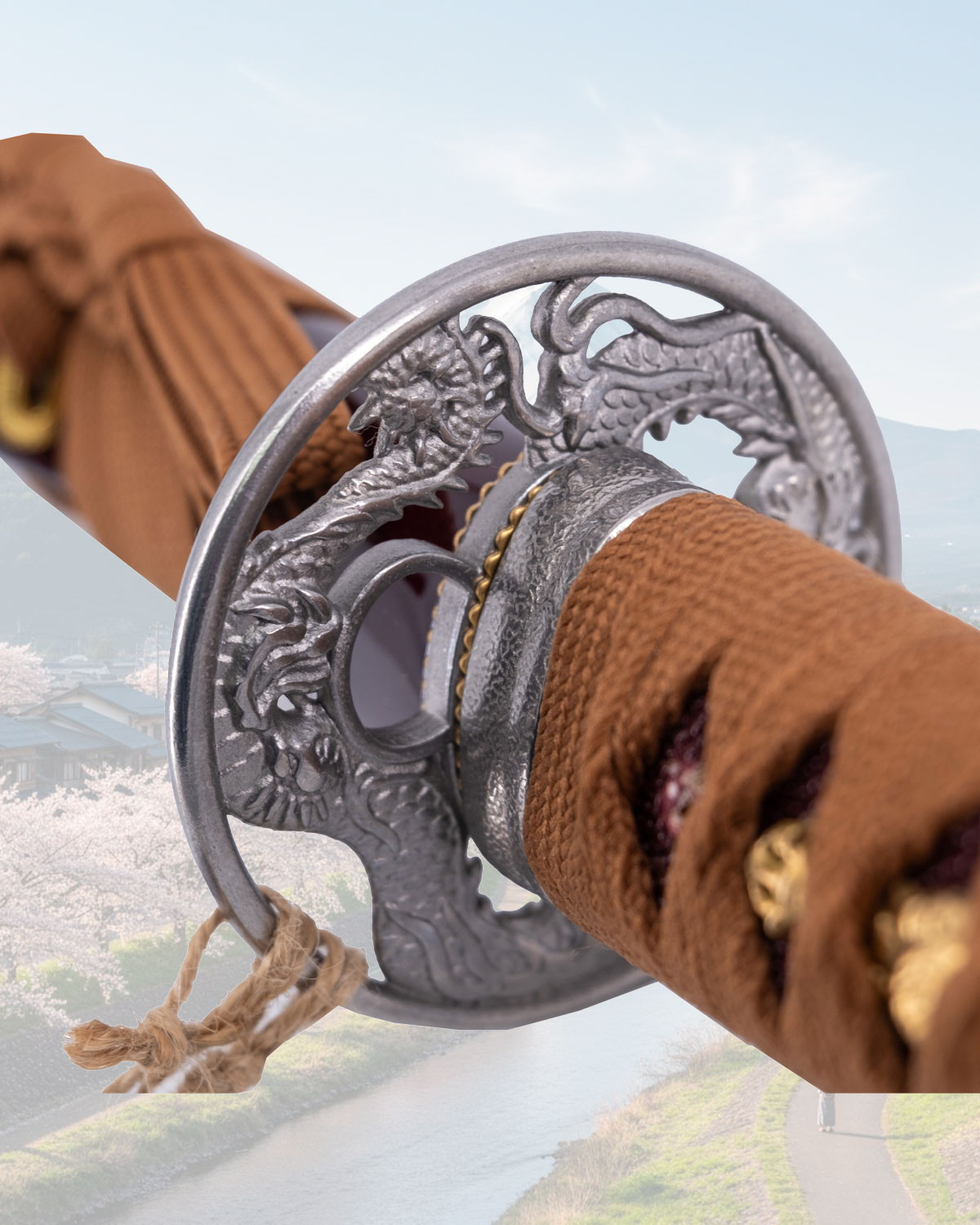 La saya laccata in marrone scuro, decorata con dragoni in tonalità dorate e rosse, protegge la lama con dignità e aggiunge un colpo visivo che spicca in qualsiasi collezione o esposizione. Un cordoncino annodato sulla parte superiore completa il tutto con carattere artigianale, perfetto da esporre insieme al supporto incluso.