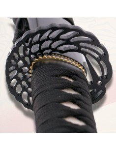 Il manico nero, intrecciato con imitazione di pelle di razza, assicura una presa comoda e salda per un uso sicuro. La tsuba o protezione, a forma di cigno in un elegante tono dorato o bronzo, aggiunge un tocco sofisticato all'insieme, mantenendo l'equilibrio perfetto tra funzionalità e stile. Il fodero laccato in nero, decorato con cigni bianchi, conferisce un'aria distintiva e rende omaggio al suo nome.