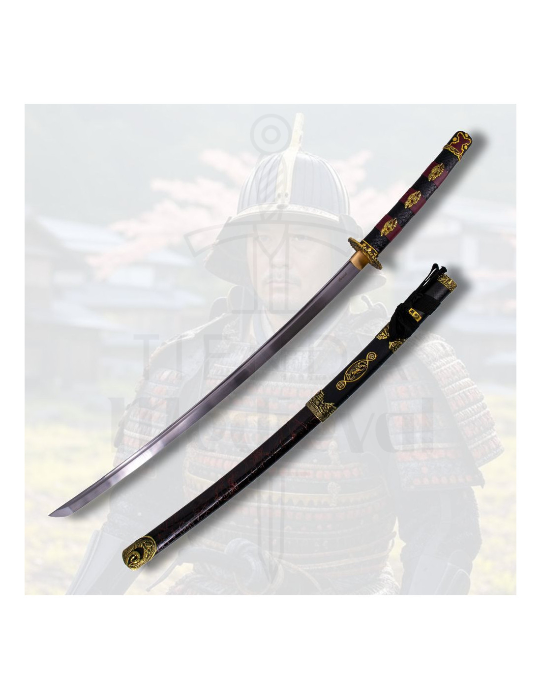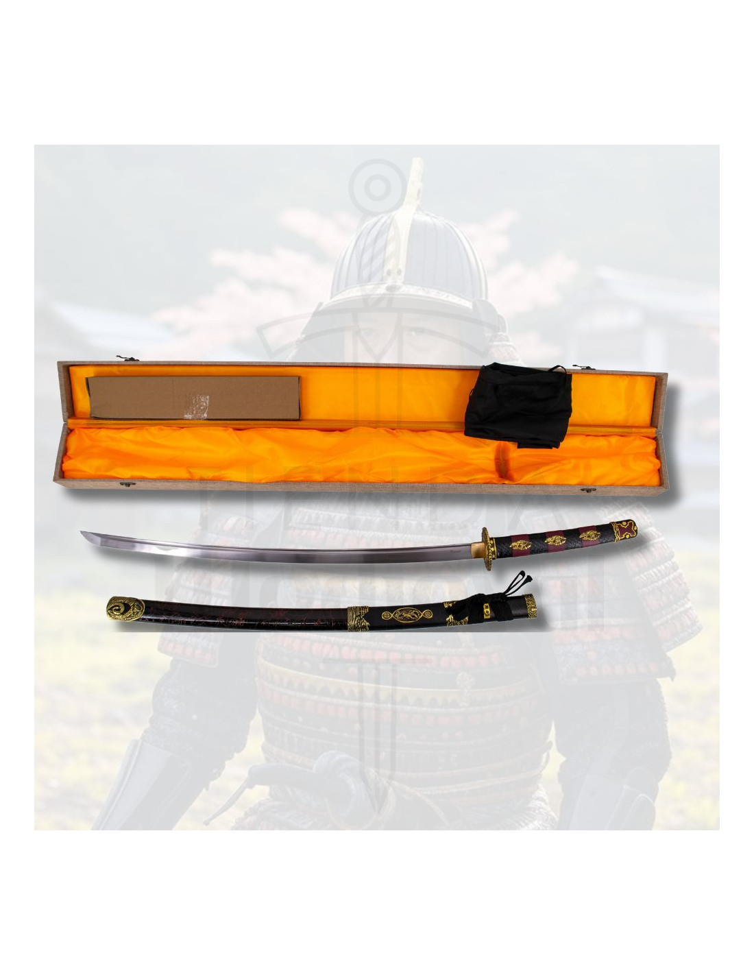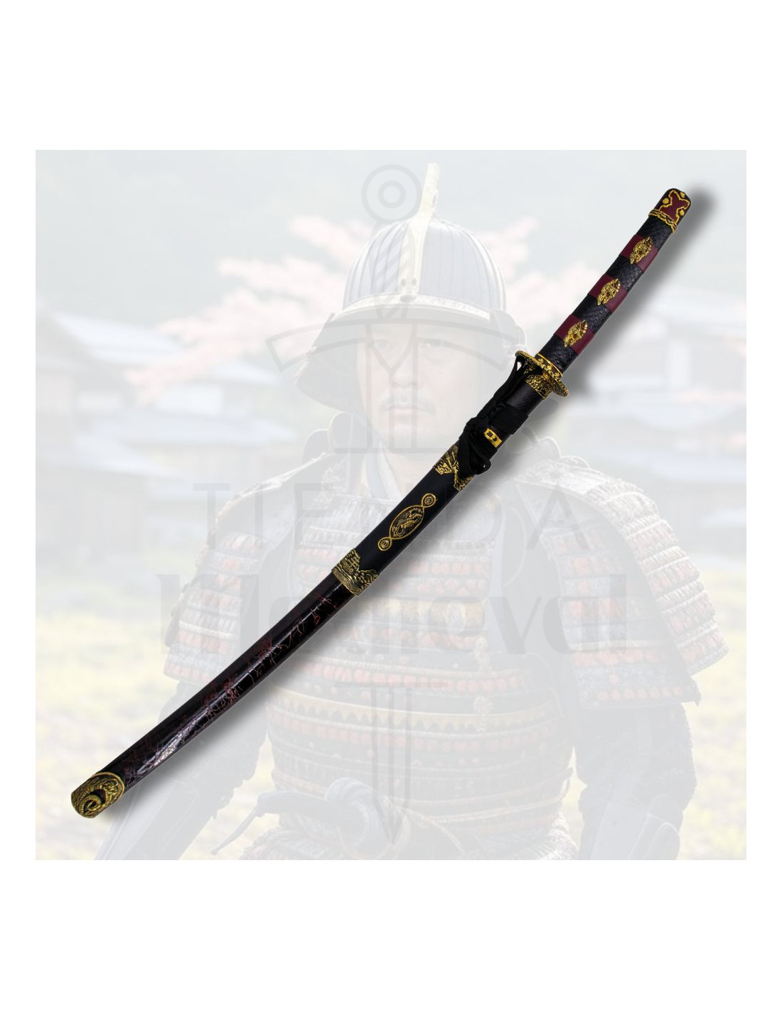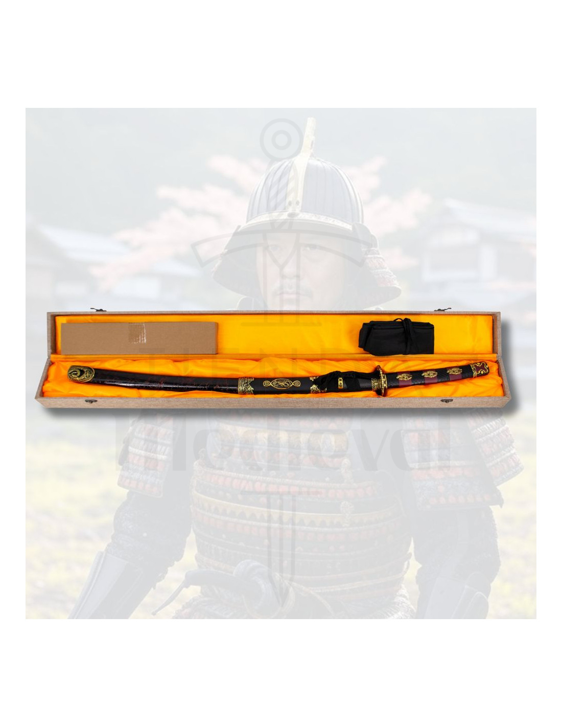 La saya nera laccata, con texture imitazione serpente e decorazioni rosse, conferisce uno stile elegante e tradizionale. Il cordone superiore facilita la maneggevolezza durante le pratiche di kata, assicurando fluidità e controllo. Il supporto incluso permette di esporla con orgoglio, valorizzandone la presenza in qualsiasi spazio.