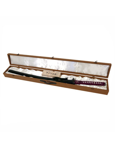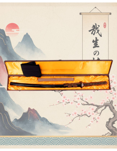 Il fodero nero liscia con cordino e la borsa di stoffa inclusa facilitano il trasporto protetto, mentre la scatola rigida in legno con interno imbottito in tonalità dorata esalta la sua presentazione, ideale per regali o per un'esposizione curata. Il kit che accompagna, con fodera di tessuto, set di tsuba e attrezzatura di pulizia, mantiene il pezzo in condizioni ottimali e pronto per la mostra.