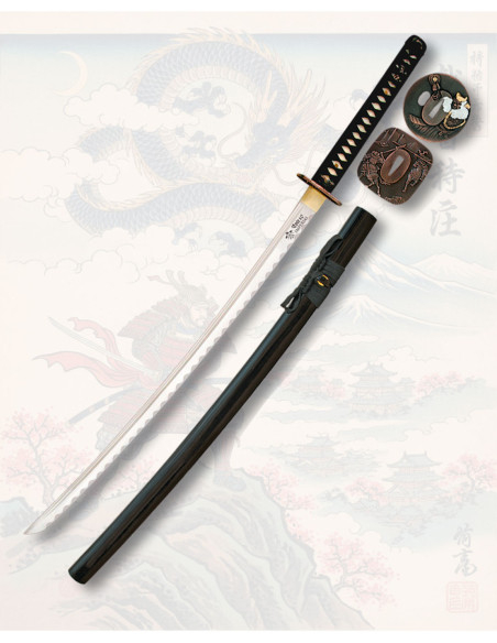 La lama curva rivela un motivo visibile nell'acciaio e un taglio con design ondulato che non solo attrae, ma garantisce un taglio definito e una linea estetica unica. Grazie al trattamento a caldo dell'acciaio al carbonio, il pezzo offre una sensazione di fermezza e ritenzione del filo, traducendosi in fiducia durante la pratica delle tecniche o nell'esposizione nella collezione.