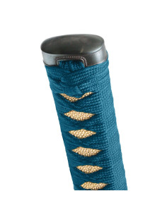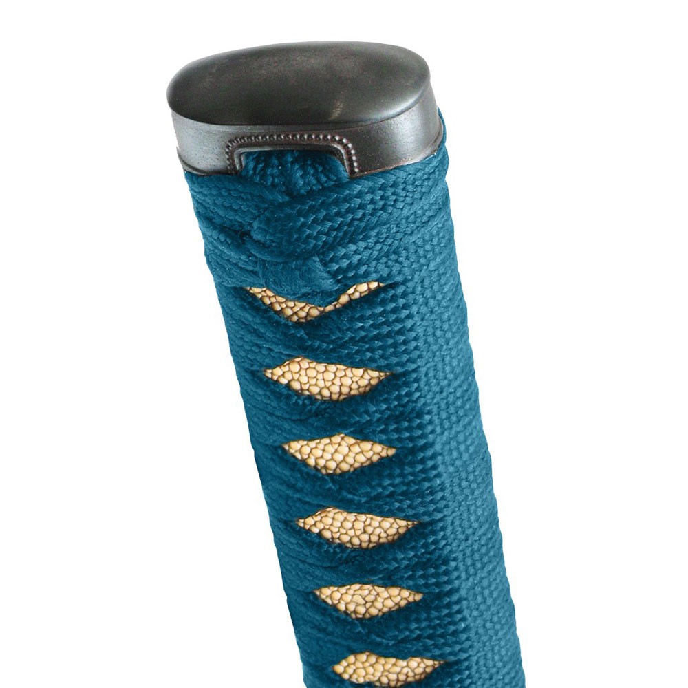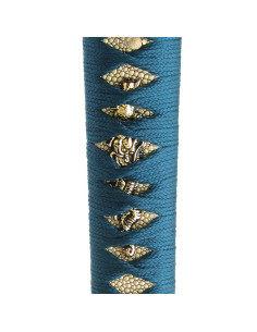 Gli accessori della Shikoto Longquan Master Teal Katana, come lo tsuba e il manico, sono realizzati in ottone massiccio, conferendogli una finitura elegante e resistente. Il manico, avvolto nel tradizionale cordino su pelle di pastinaca macchiata di tè, offre una presa comoda e sicura.