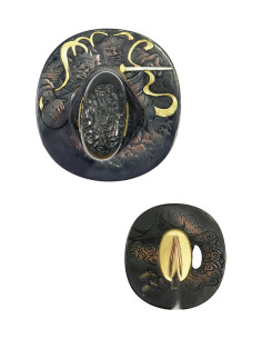 Lo tsuka di pelle di razza usato sull'elsa è della migliore qualità, e lo tsuka-ito e il sageo sono tessuti con la migliore seta giapponese. Dettagli in bronzo scuro, con decorazioni in rilievo e dettagli selettivi in rame, argento e oro, su fuchi, kashira, kojiri, koiguchi e kurigata danno un tocco di eleganza a questa spada. La tsuba è realizzata in rame temprato e annerito, con decorazione a rilievo e dettagli selettivi in argento e oro. L'habaki è di costruzione in due pezzi, con la sezione interna di rame e la sezione esterna di ottone placcato oro. La saya è profondamente laccata di rosso, con una sezione nera scolpita ad anello all'imboccatura.