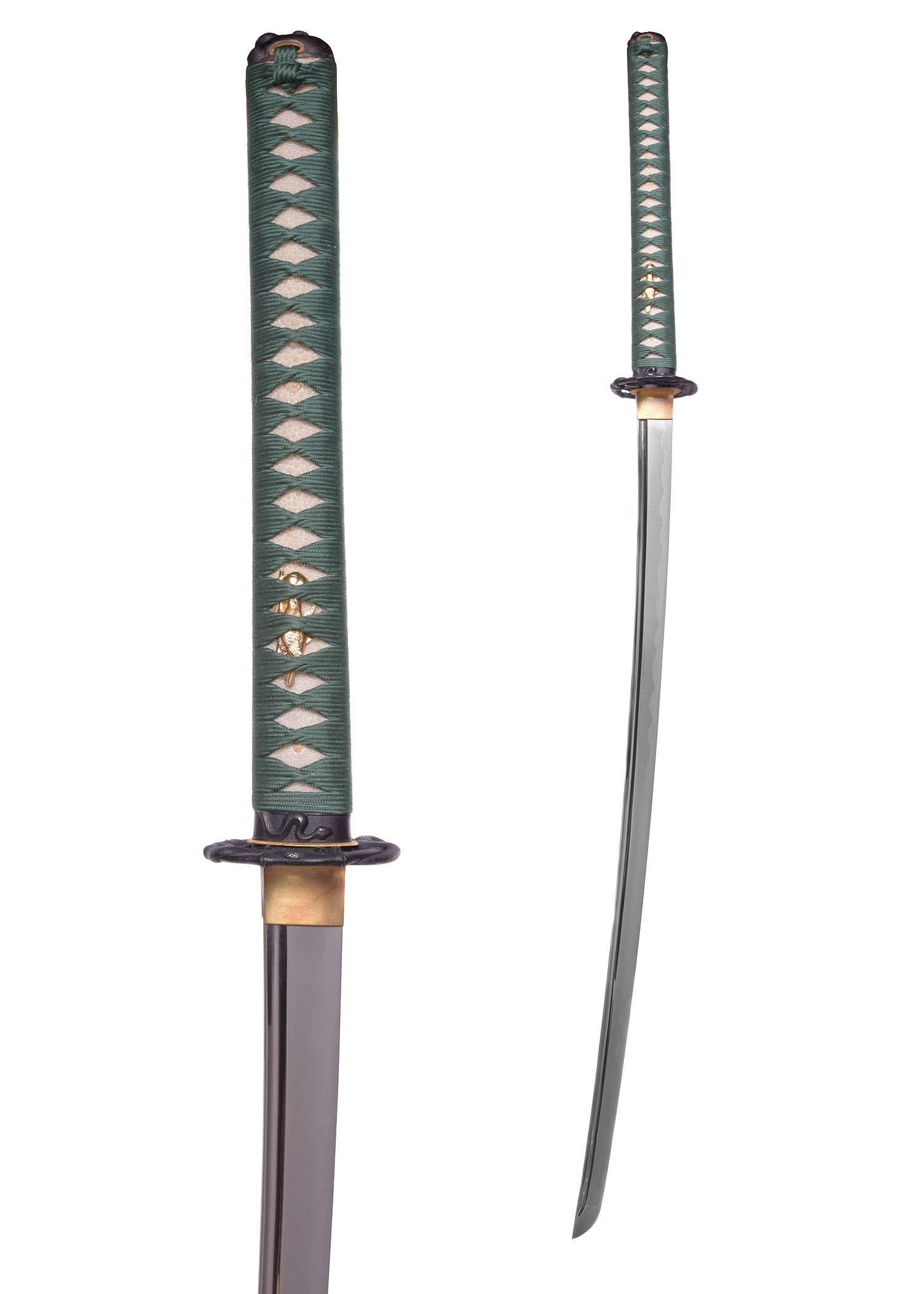 L'elsa avvolta in pregiato cotone nero e pelle di razza bianca con un paio di menuki a forma di uccello fornisce una presa comoda e sicura. Inoltre, la saya laccata in una bellissima tonalità di verde contrasta perfettamente con il sageo in cotone nero, rendendo questa katana ancora più imponente.