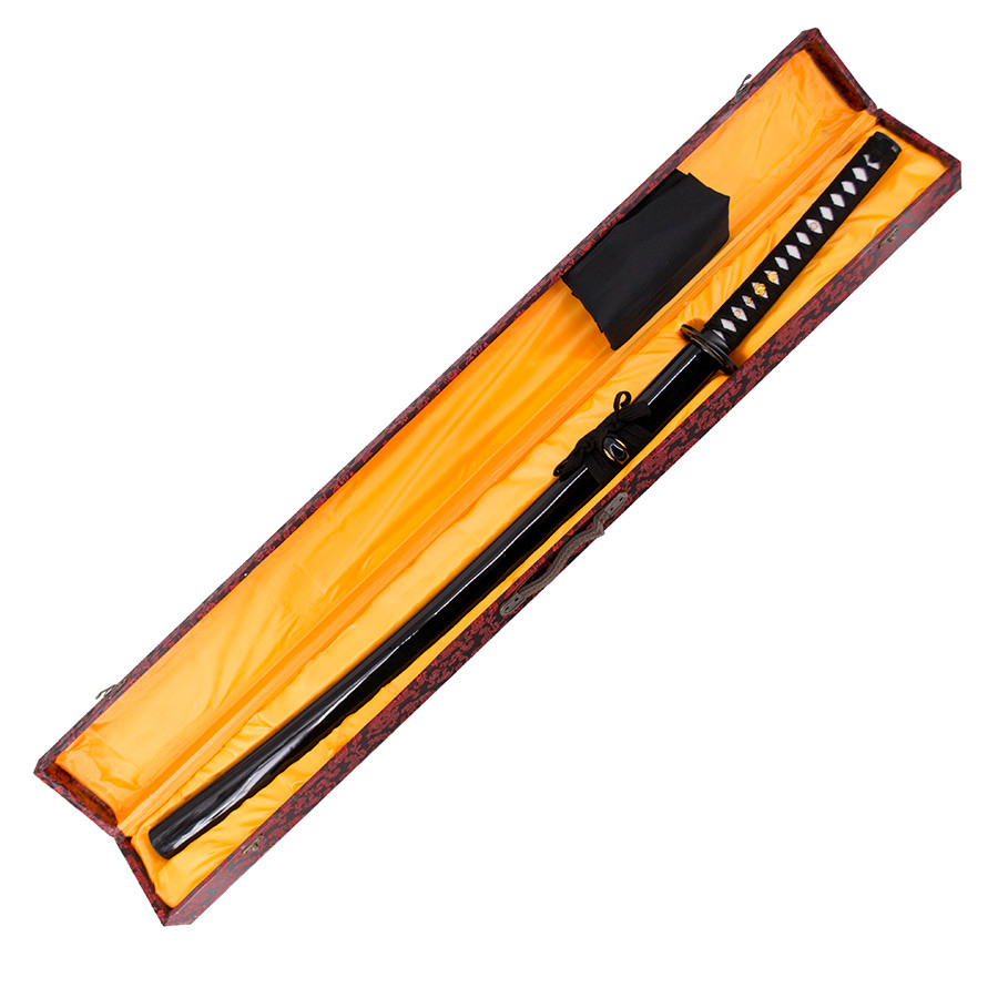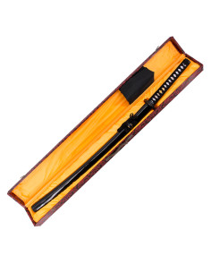 Katana Funzionale con lamiera di acciaio al carbonio AISI 1045 con bordo. La guaina è nero come la stringa. Maniglia con stringa nera. Include scatola di legno foderato di tessuto decorativo presentazione.
