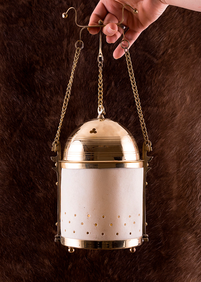 Il nostro lampione si basa su quelli esistenti a Roma durante i secoli I-III d.C., quindi puoi avere tra le mani una replica affidabile di quei tempi storici. È realizzato in ottone rivettato, che gli conferisce un aspetto forte e autentico. Inoltre, è rivestito in pelle naturale, tipo pergamena, ventilata con fori, che permette alla luce di diffondersi in modo morbido e piacevole.