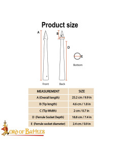 Le dimensioni sono impressionanti: misura circa 24,1 centimetri di lunghezza con un diametro di circa 1,6 centimetri per l'asta. Questa lancia è progettata per adattarsi a un manico robusto e fornire un equilibrio eccezionale.