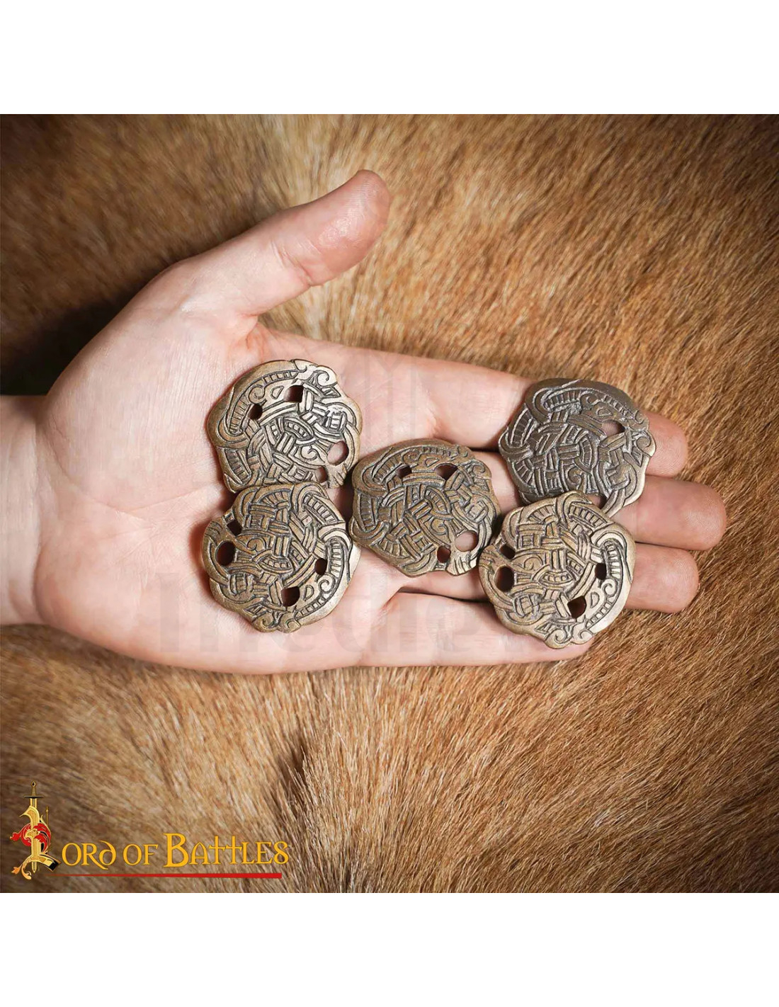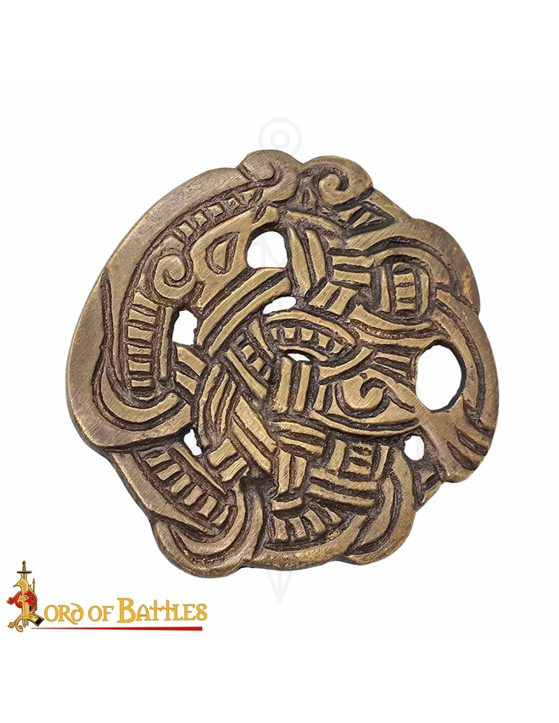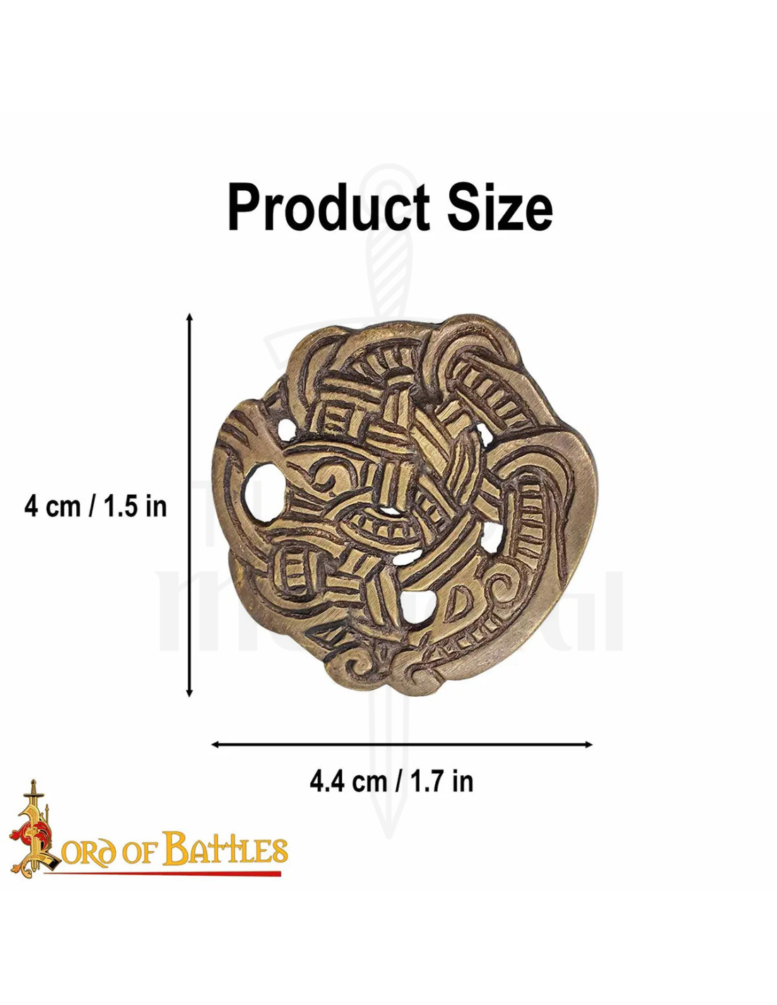 La Decorazione vichinga per cintura in ottone finitura antica si distingue per il suo aspetto traforato e i suoi motivi intrecciati, che giocano con la luce e mostrano ogni curva del design. Grazie al tono di bronzo invecchiato, i rilievi guadagnano profondità e l'accessorio sembra aver vissuto altre epoche, dando al tuo capo un aspetto autentico senza necessità di processi complicati.