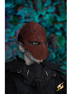 La maschera si adatta comodamente alla testa e si fissa con un supporto in pelle scamosciata intrecciata lungo l'attaccatura dei capelli sulla nuca. Questo sistema di adattamento garantisce che la maschera rimanga al suo posto, permettendoti di muoverti con sicurezza e agilità durante le tue avventure.