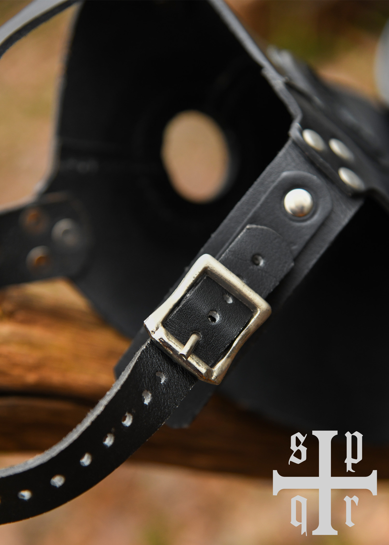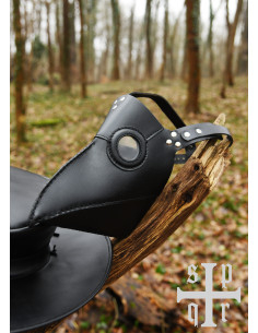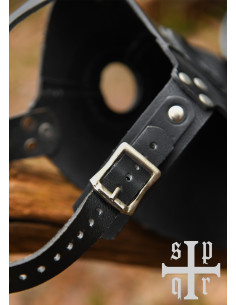 La maschera, realizzata con la stessa pelle resistente, non è solo un accessorio accattivante, ma è anche progettata per adattarsi perfettamente a diverse dimensioni di testa. Con dettagli come rivetti e cuciture a vista, ogni pezzo è unico, riflettendo la bellezza della pelle naturale. Inoltre, il suo foro di ventilazione assicura che tu possa goderti l'esperienza senza compromettere il tuo comfort.