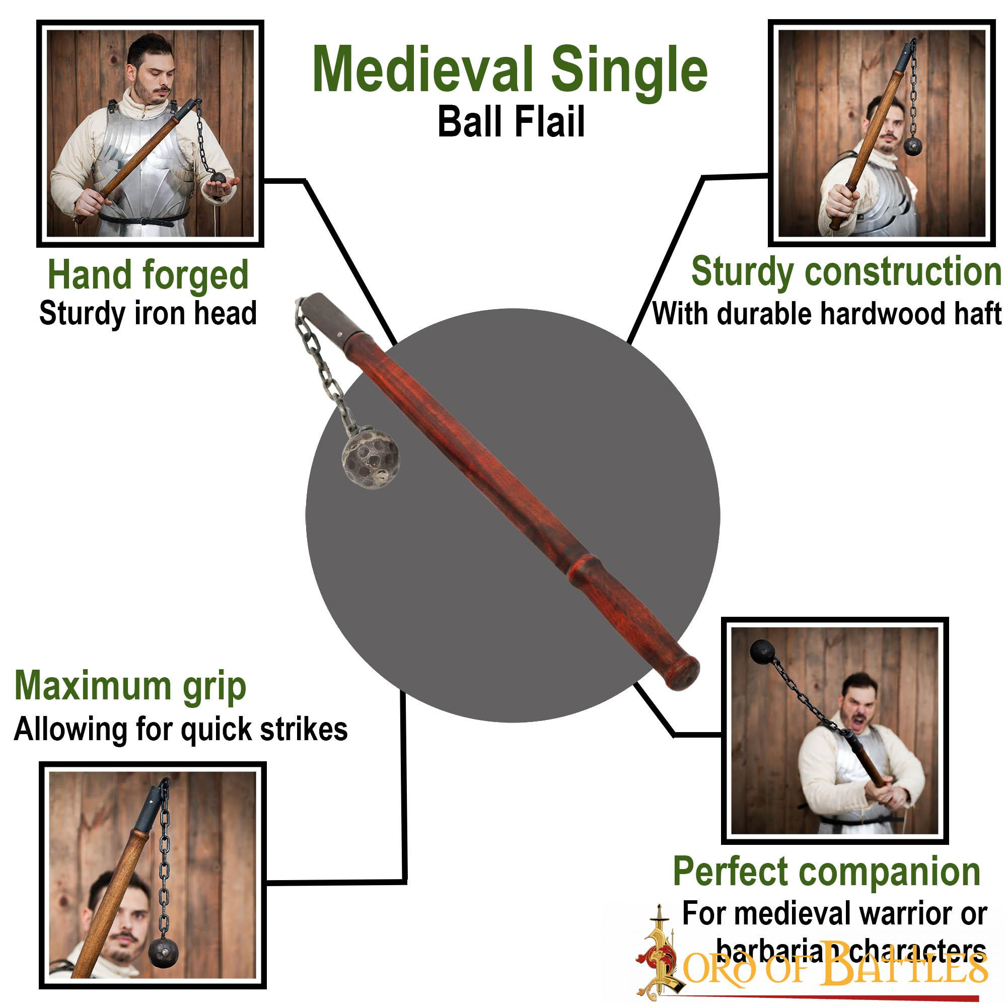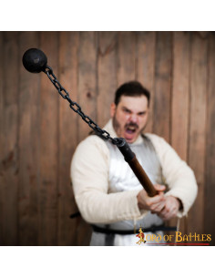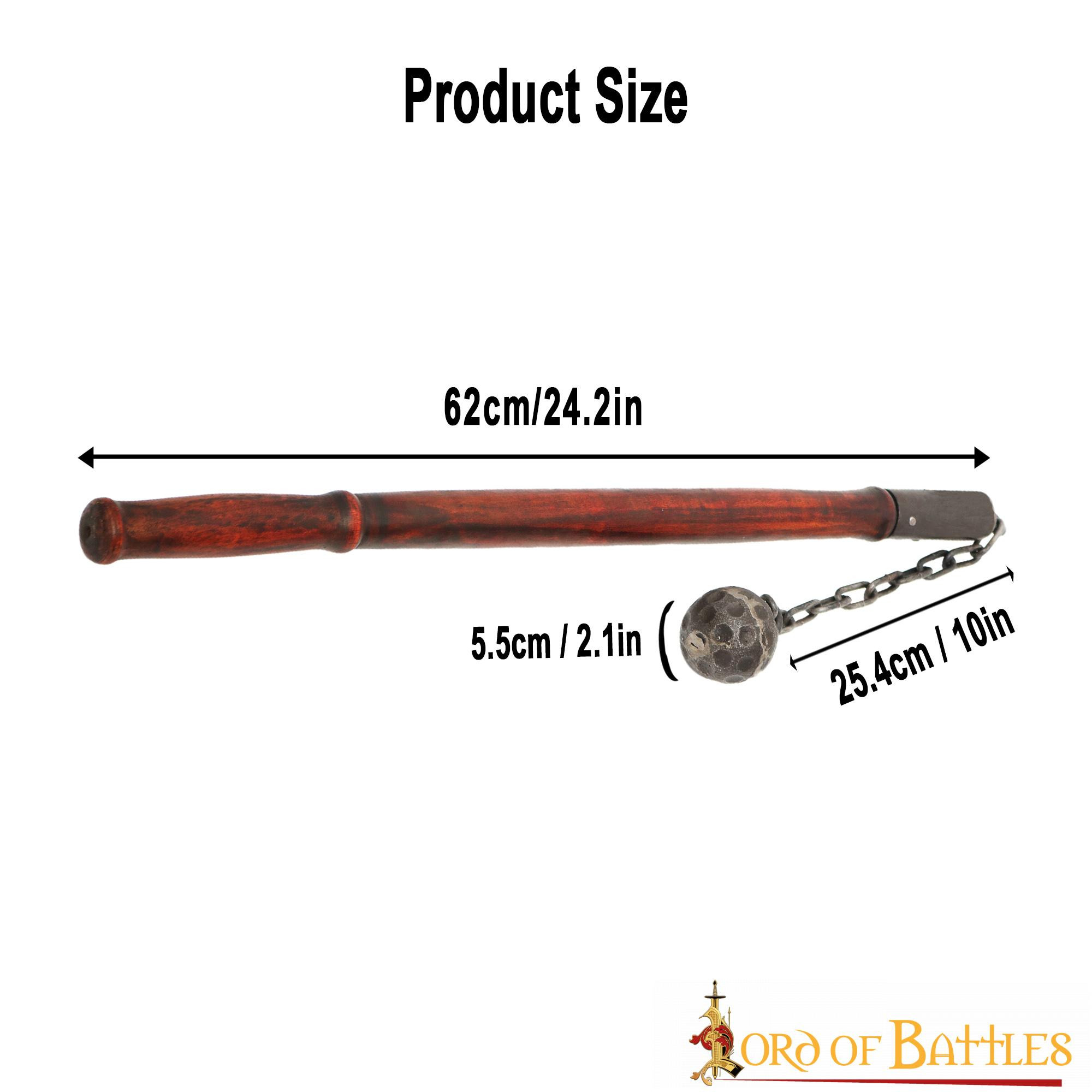 Preparati a incutere timore nei cuori dei tuoi nemici con la nostra mazza medievale con palla e catena senza punte! Questa potente arma medievale è caratterizzata da una palla di ferro battuto di circa 5 centimetri di diametro collegata ad una robusta catena di ferro lunga circa 25 centimetri (realizzata in ferro spesso 5 mm, con anelli larghi circa 2,5 cm). L'asta in legno lunga circa 61 centimetri è progettata per offrire presa e controllo ottimali. Presenta una finitura naturale tradizionale ed è ideale per un personaggio soldato o mercenario.