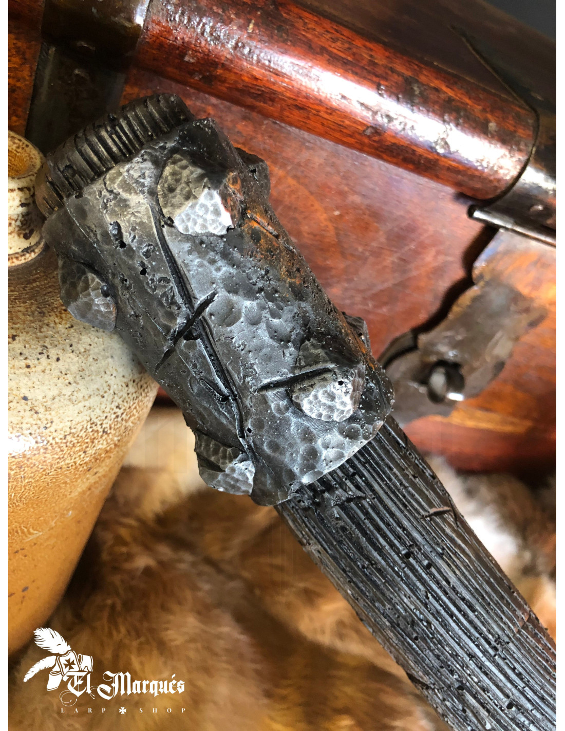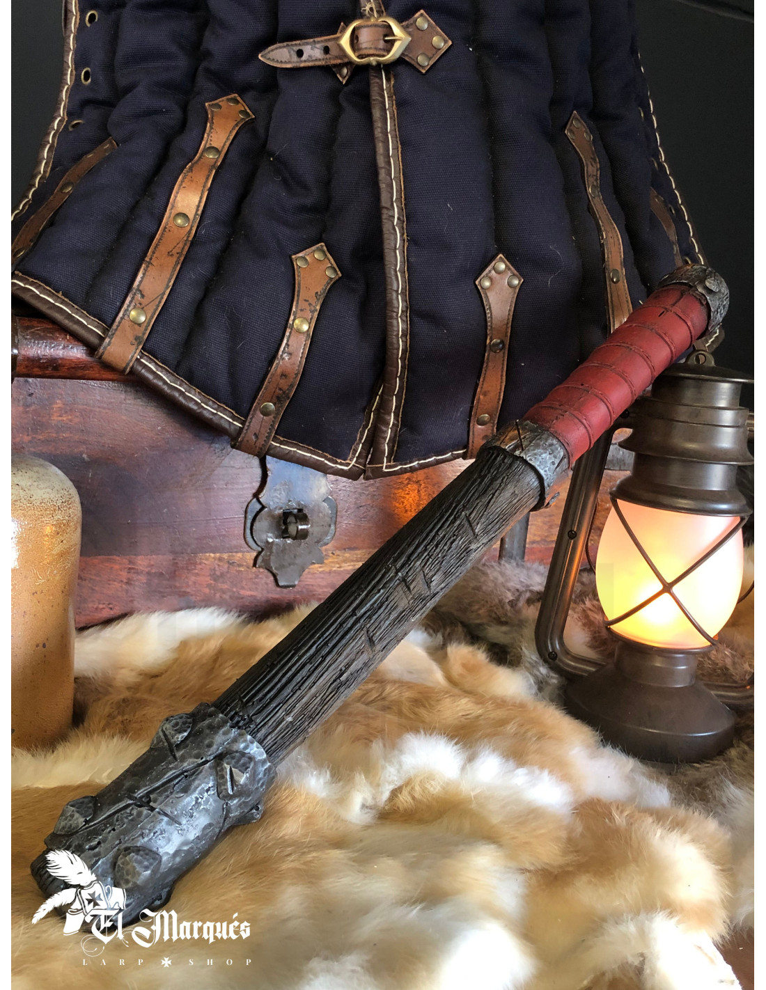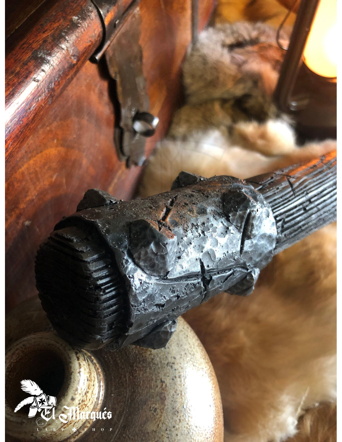 Con una testa che imita il metallo invecchiato e rinforzi sul manico che sembrano acciaio forgiato, trasmette autorità e minaccia all'istante, ideale per personaggi come guardie implacabili, capitani di pattuglia o villain che necessitano di una presenza convincente senza rinunciare alla sicurezza in combattimento.