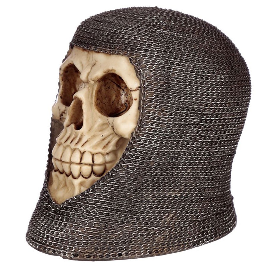 Teschio medievale in miniatura con carnefice. Realizzato in resina.