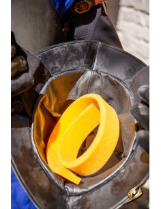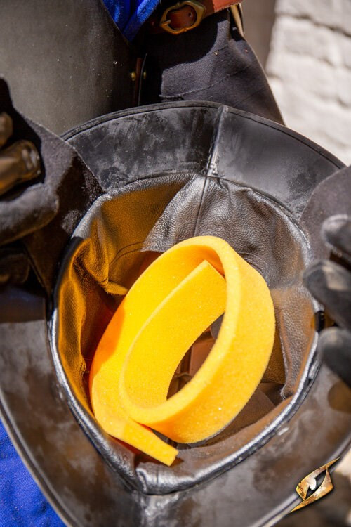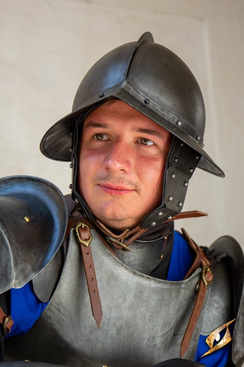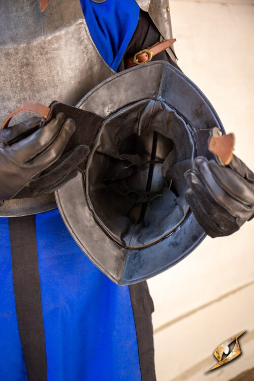 Fissare il Morion regolando il cinturino in pelle sotto il mento, mantenendo il casco saldamente in posizione. Costruita in acciaio spesso 1 mm e cinturini in pelle di alta qualità, questo pezzo di armatura è costruito per resistere all'uso costante in LARP o rievocazioni storiche, purché venga prestata la dovuta cura.