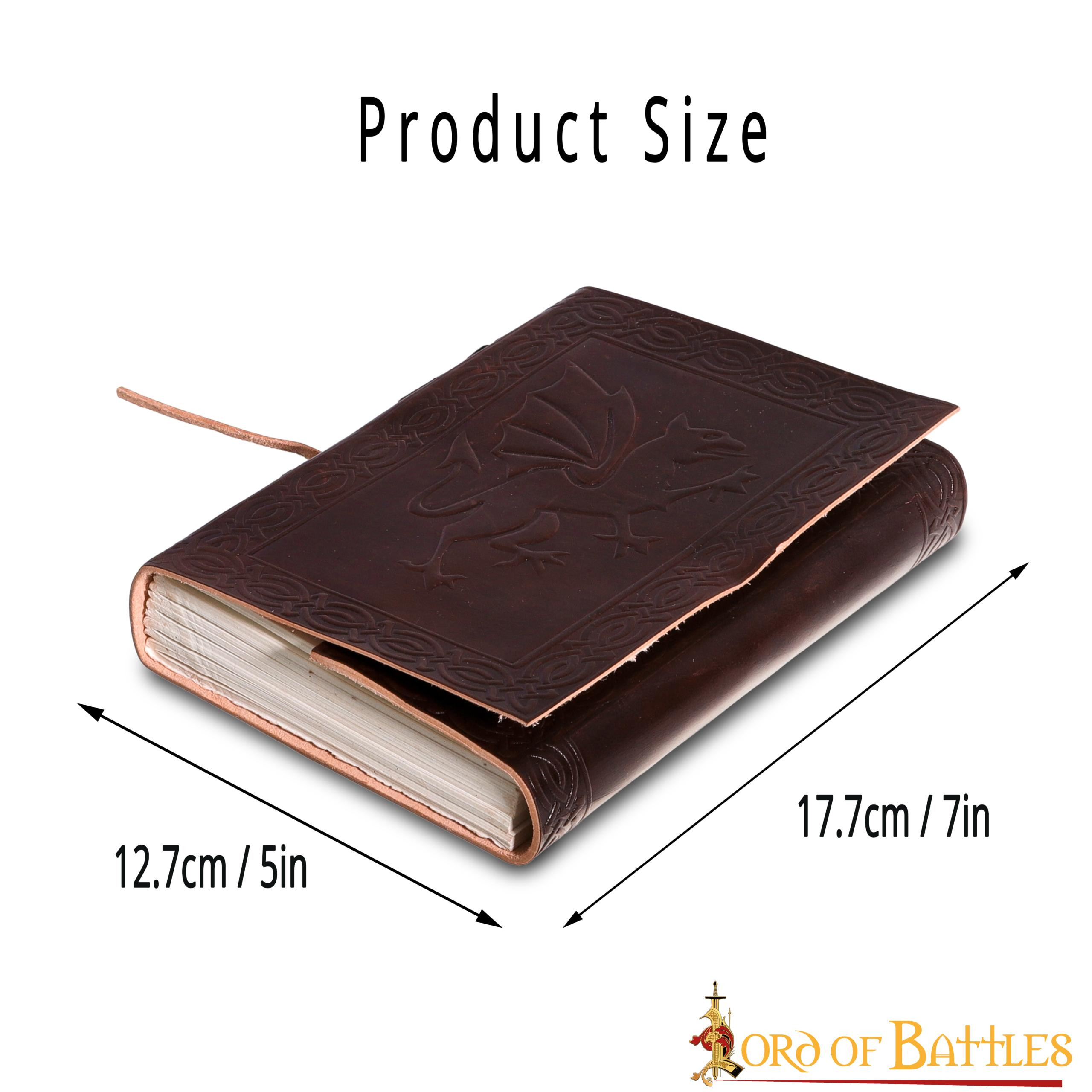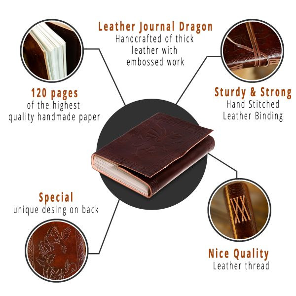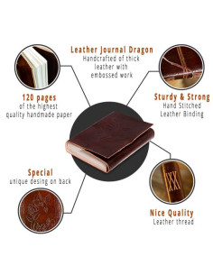 Diario di appunti Il Dragone. Il nostro diario in pelle (7 X 5) pollici è accuratamente realizzato a mano in vera pelle e ha 110 pagine naturali fatte a mano di alta qualità, rilegate insieme con robuste stringhe di tessuto.